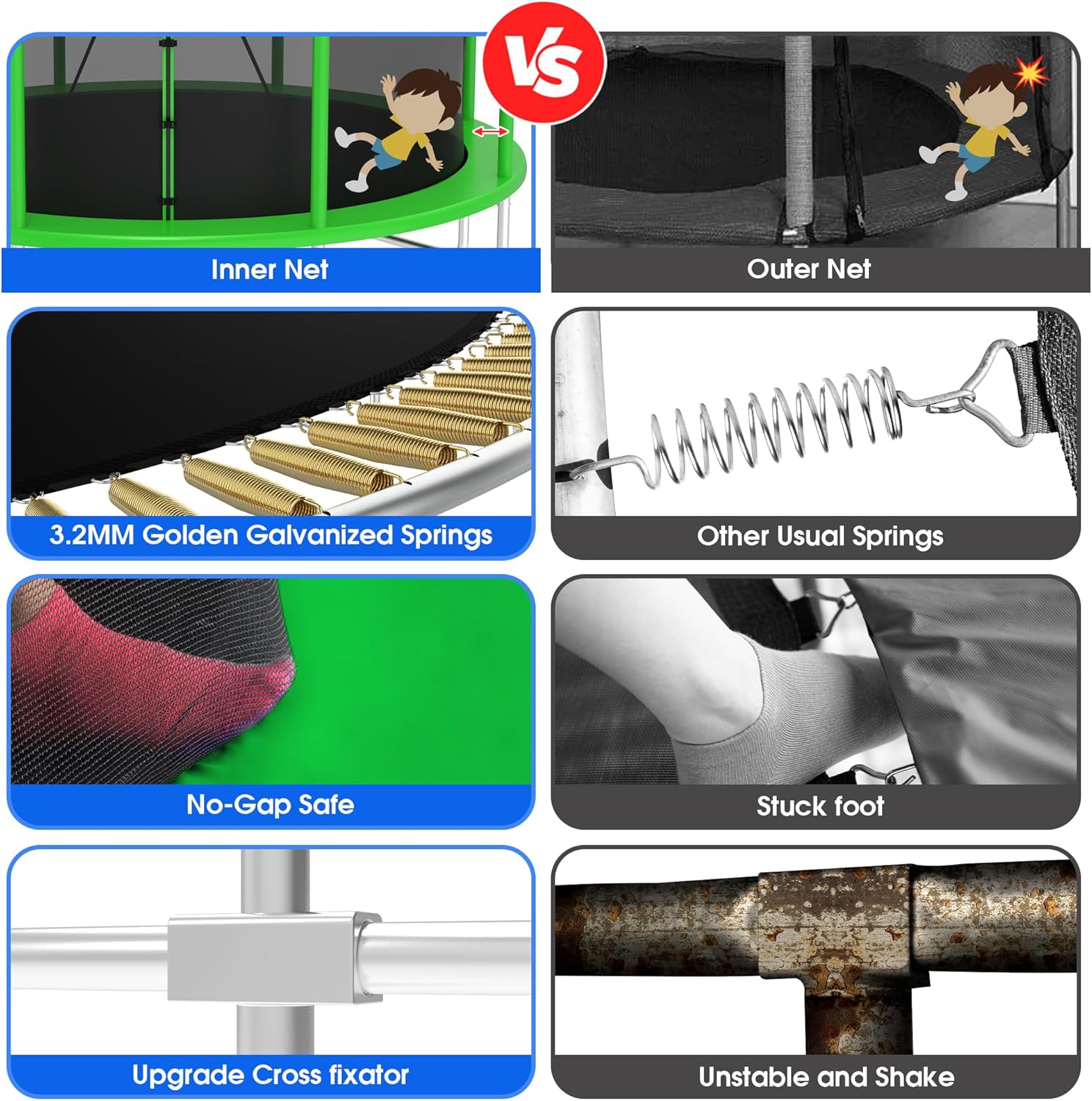 👍Bounce Free, Secure Body: XMIKA trampoline body comes along with snap lock, the button-type poles you incessantly see on tents, they do an important job of holding the body steady. It’s an INNER-NET trampoline. The online performs an essential function in dividing the springs and the bounce space. The online was secured with the leaping mat seamlessly by the lengthy rope. And the springs are wrapped by the froth spring pad. Supplying a security leaping space in your youngsters.