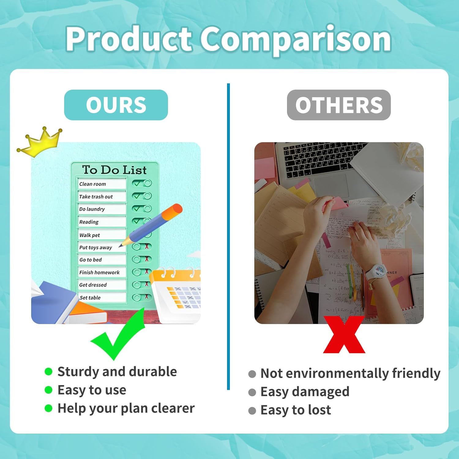 UPGRADED DESIGN: The slider operate of this chore chart has been upgraded. It slides effortlessly and would not come unfastened when mounted. Manufactured from sturdy and odorless plastic to make sure longevity.
