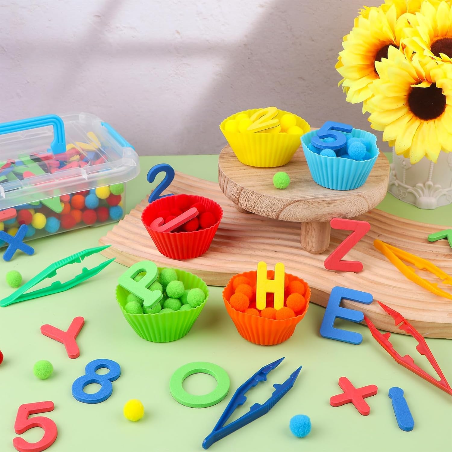 Sensory Bin Filler Set: these letters and numbers sensory bin fillers comprise 200 felt pom poms, 26 uppercase letters, 26 lowercase letters, 24 numbers and symbols, 5 sorting cups, 4 tweezers and 1 storage field, making them a whole sensory bin filler package that gives ample amount on your baby to play