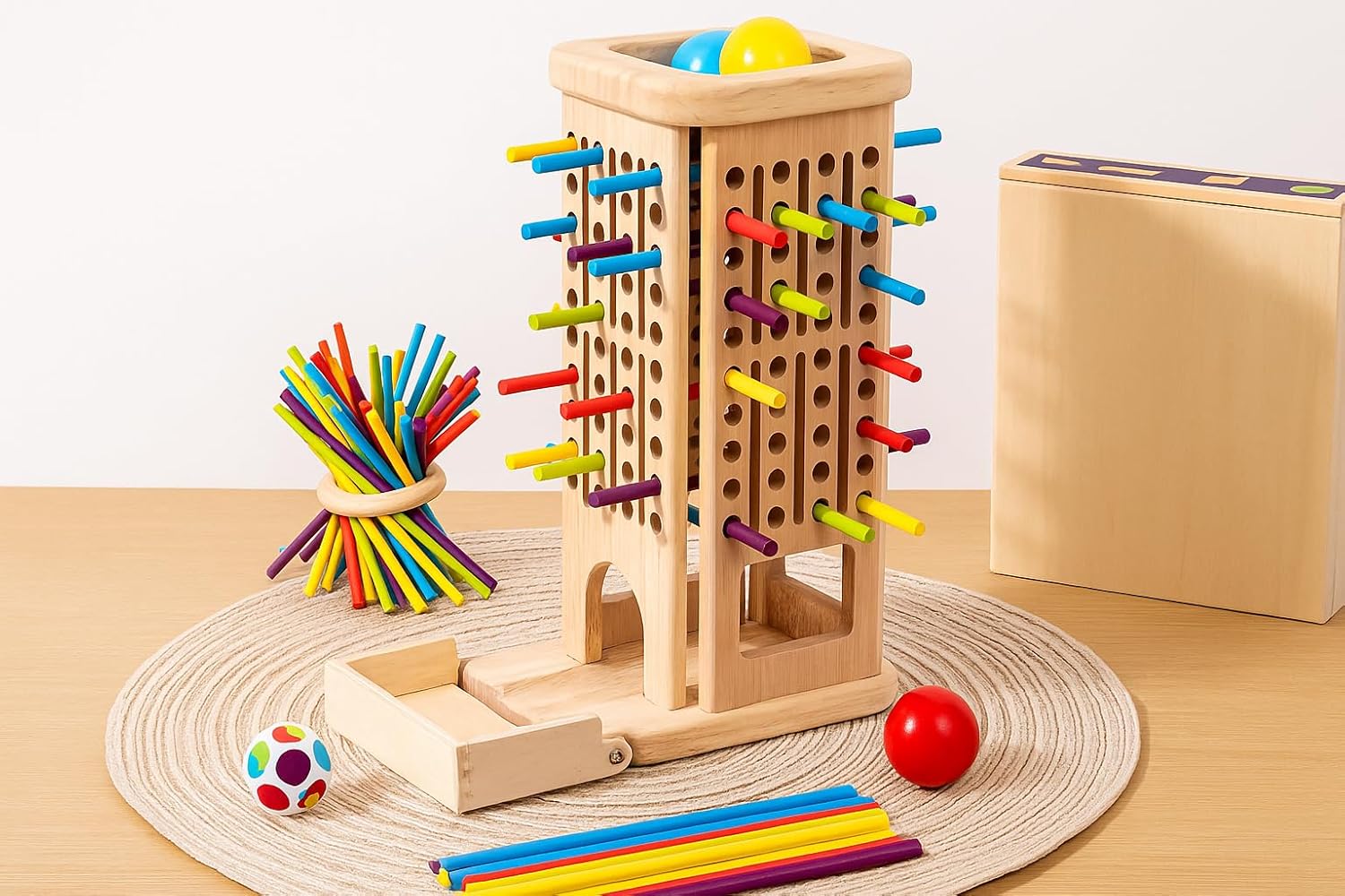 Montessori-Impressed Sorting & Technique Recreation – This picket tower recreation blends the enjoyable of hands-on play with academic advantages. Impressed by Montessori rules, it encourages sorting, colour recognition, hand-eye coordination, and strategic considering. Kids develop high quality motor abilities and persistence as they fastidiously take away sticks and observe the cause-and-effect relationship with falling balls—making it an ideal instrument for unbiased or group play.