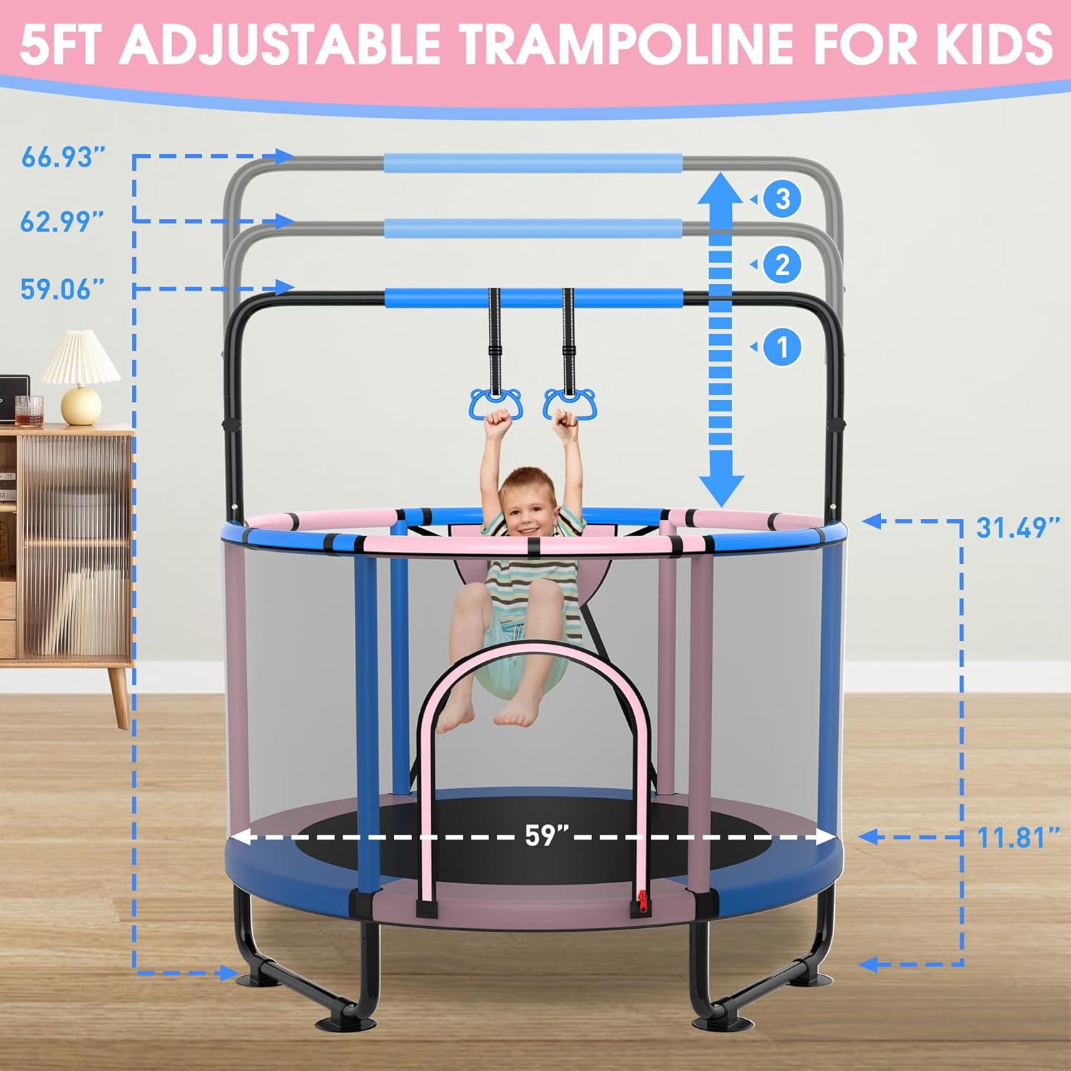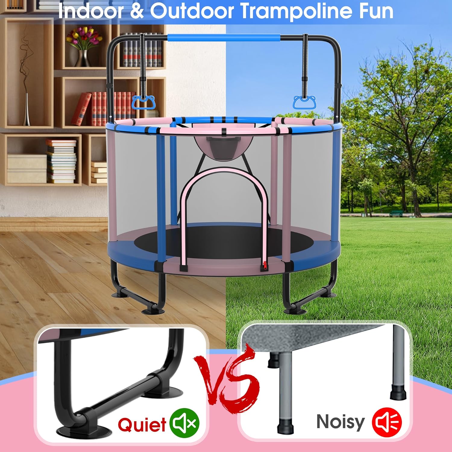 🌸3 Adjustable Gymnastic Bar: SKYUP small trampoline features a 3-level adjustable top gymnastic bar which might be eliminated when not wanted, The gymnastics bar has a security foam cowl within the center for youngsters to play with peace of thoughts. It may be adjusted from 55 inches to 59 or 62 inches. An excellent selection for teenagers to get some train and get away from electronics, the indoor/out of doors trampoline will fill your room or yard with children’ laughter.