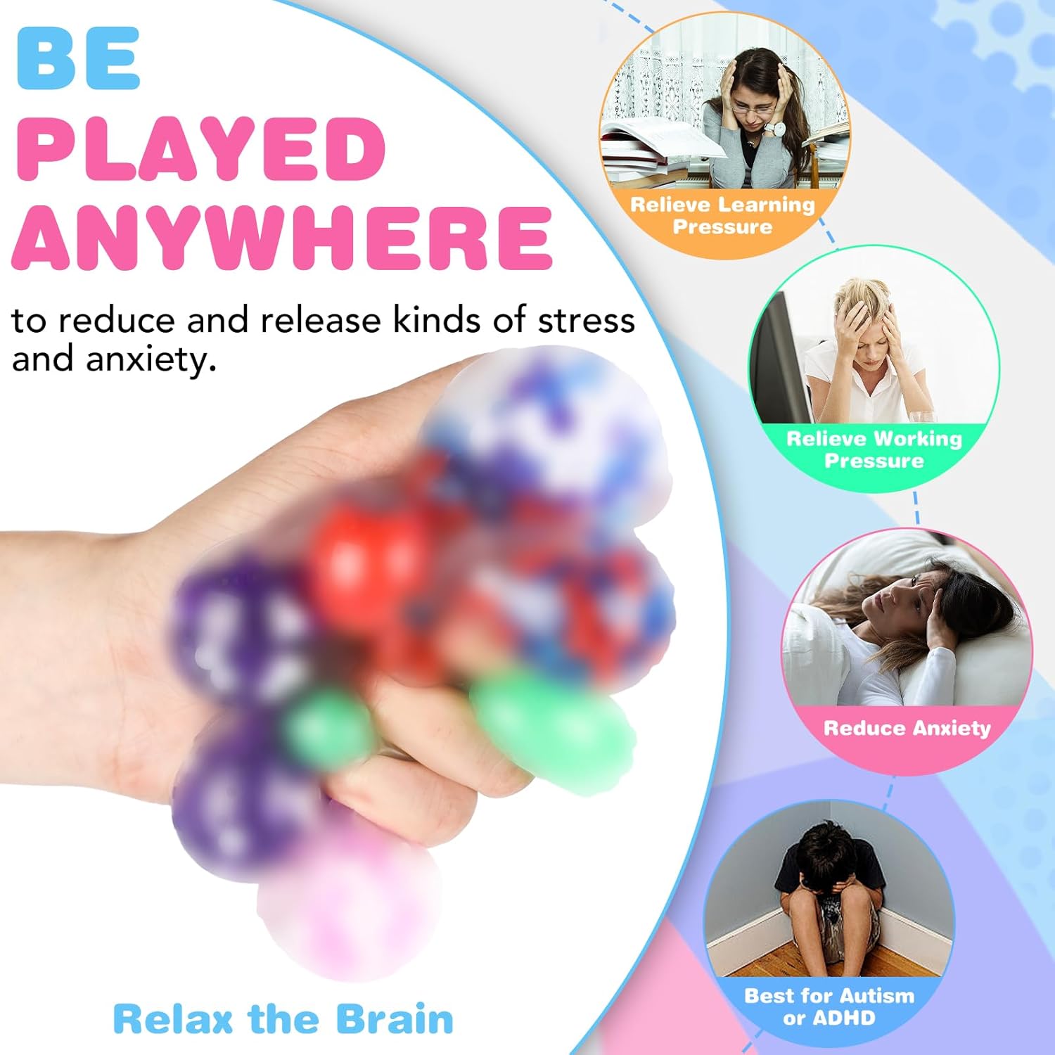 24 packs of stress balls can simply be stuffed into pockets, backpacks, baggage, as journey toys. These eye-catching stress balls are sturdy, gentle and light-weight for adults, offering countless hours of enjoyable.
