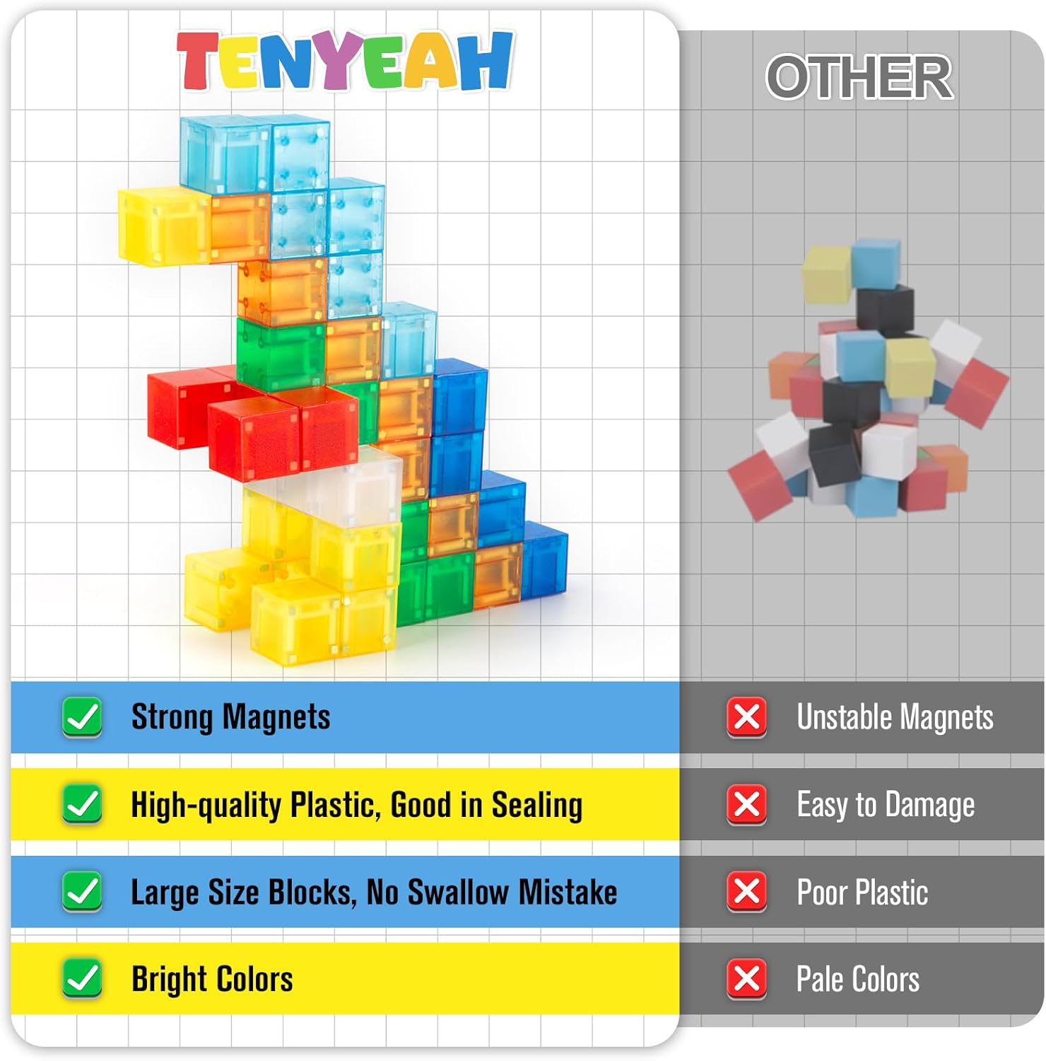 【Protected Sturdy & Stronger Magnet】Security is all the time our high precedence. TENYEAH magnetic blocks are made of top of the range and secure meals grade ABS plastic and tremendous sturdy neodymium magnets. The magnets are ultrasonically welded and sealed in a plastic field that’s drop resistant, waterproof and colorfast. These blocks are medium sized and have easy edges, making them straightforward for toddlers to grip and construct with out the chance of scratching their palms. This ensures hassle-free playtime. These blocks stand as much as frequent use and supply long-lasting enjoyable for youngsters of all ages