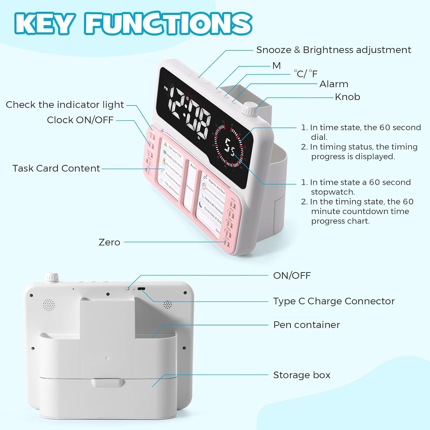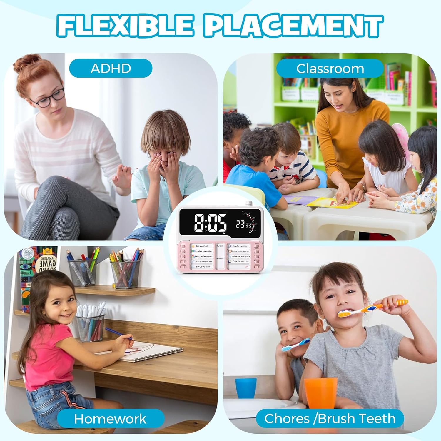 • 7-in-1 Visual Timer for Kids & Adults with Task Planner – ADHD Time Management Tool with Alarm, Countdown, Calendar, Temperature Display & Storage – Ideal for Home, School (Pink)