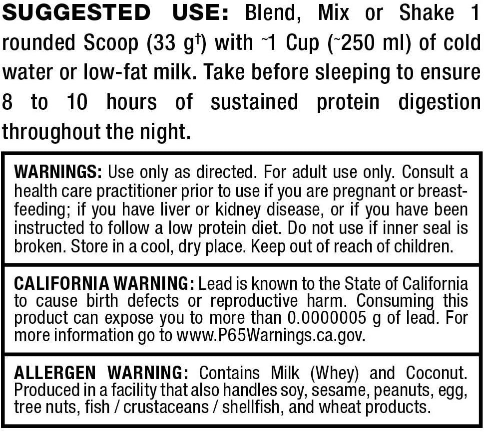 SUGGESTED USE – Combine or shake 1 scoop with as much as 6 oz of water or milk previous to sleeping or any time you wish to enhance your protein and cut back muscle breakdown. Ideally suited to any time you might be unable to eat high-protein meals.