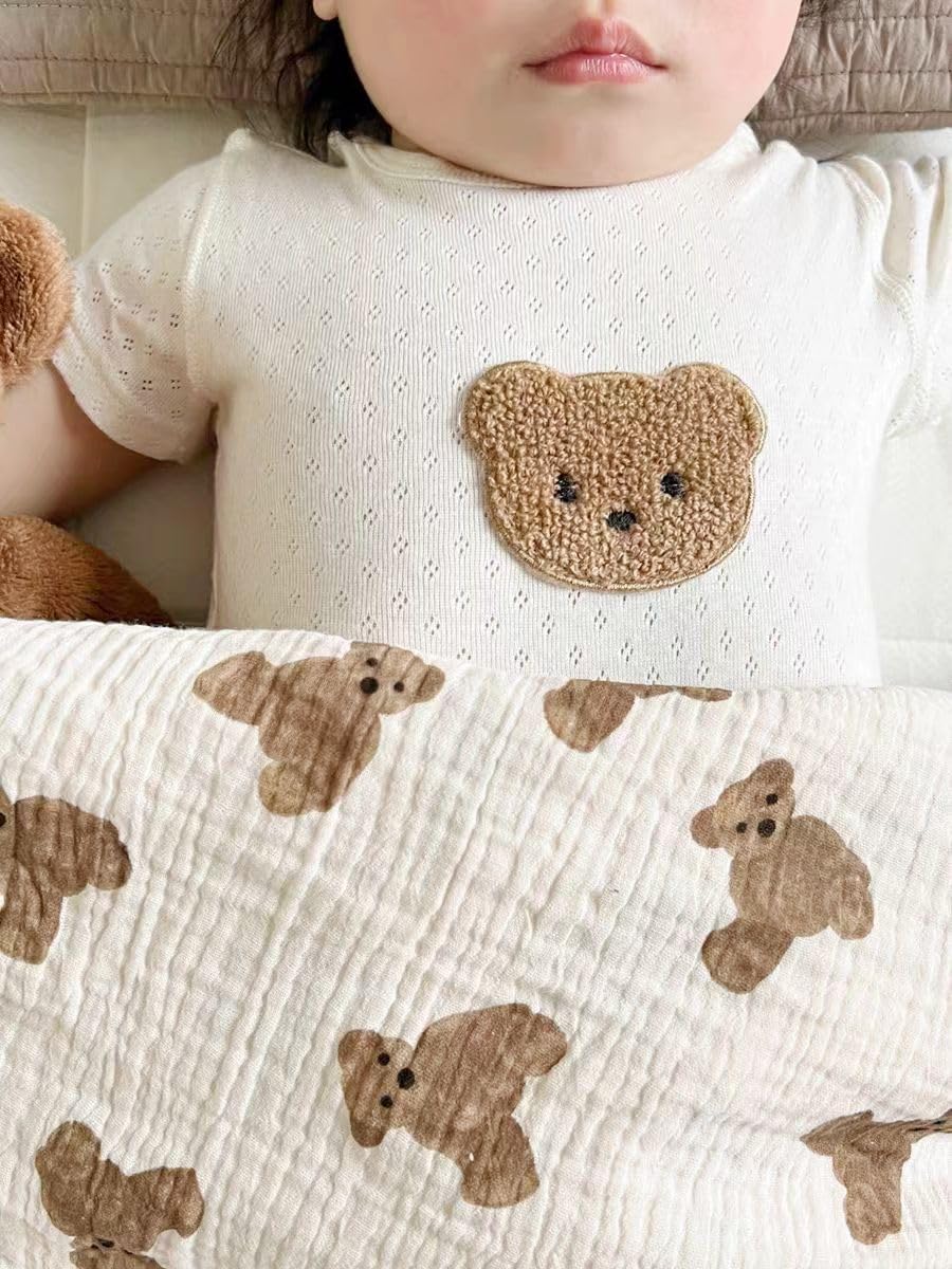 • Baby Blanket Double Layer Cotton Muslin Thick Quilt Neutral 40x40Inch Soft Throw Blanket Bear Pattern