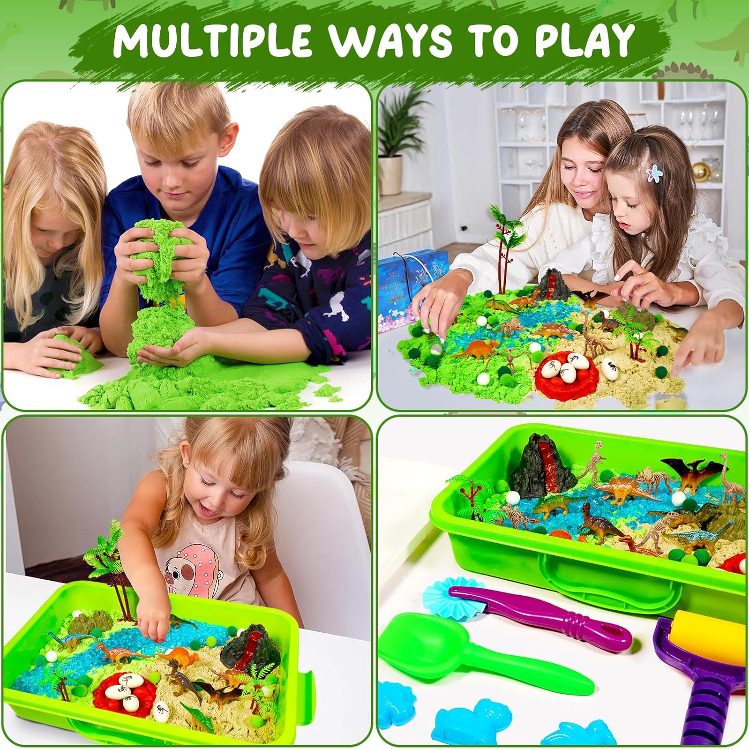 Dinosaur Sensory Bin Package: The sensory sand package comes with a storage field, 2 baggage sensory sand, 10 dinosaur molds, 9 instruments and loads of ornamental equipment, can meet your completely different wants
