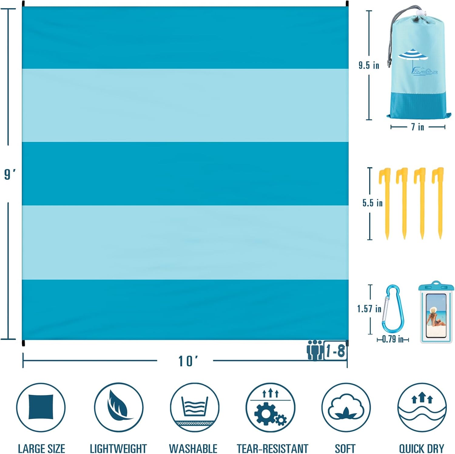 🌴BEACH BLANKET SANDPROOF WATERPROOF:10’×9′ matches 1-8 adults.Made with ripstop 210T polyester.The sand will fall down whenever you shake the blanket.The little water left behind will dry out in minutes.