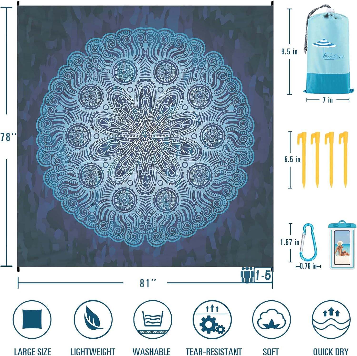 🌴BEACH BLANKET SANDPROOF WATERPROOF:78”×81” suits 1-5 adults.Made with ripstop 210T polyester.The sand will fall down whenever you shake the blanket.The little water left behind will dry out in minutes.