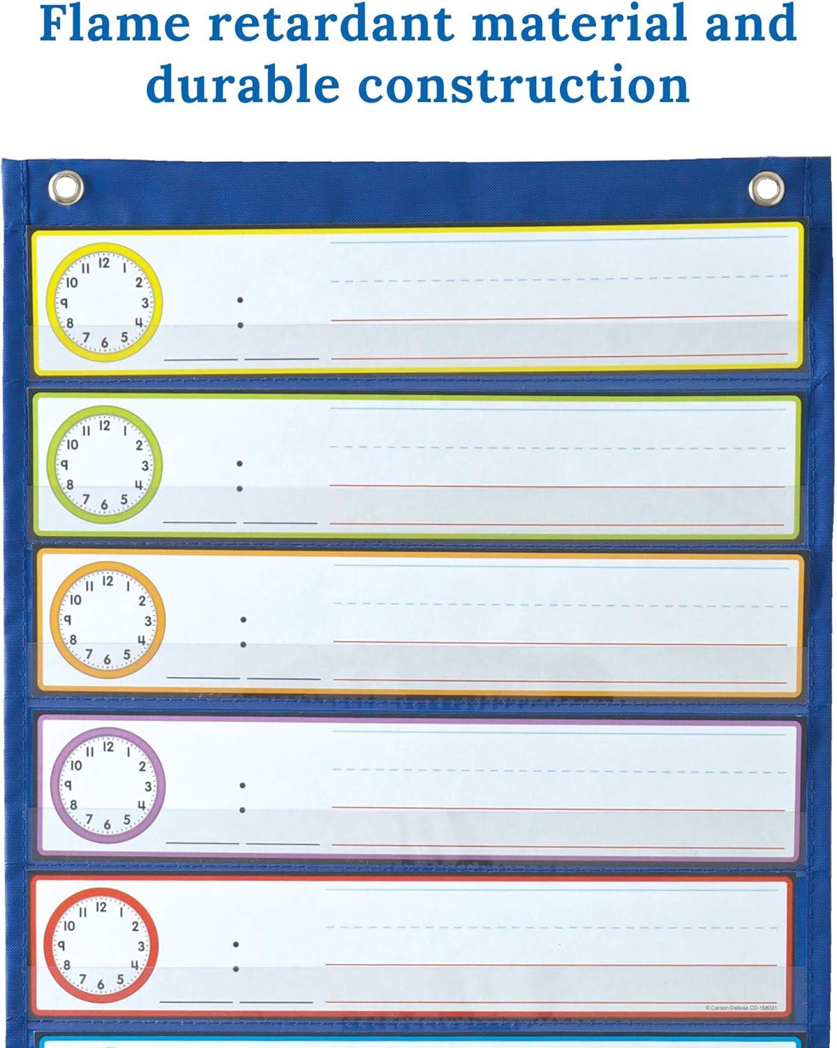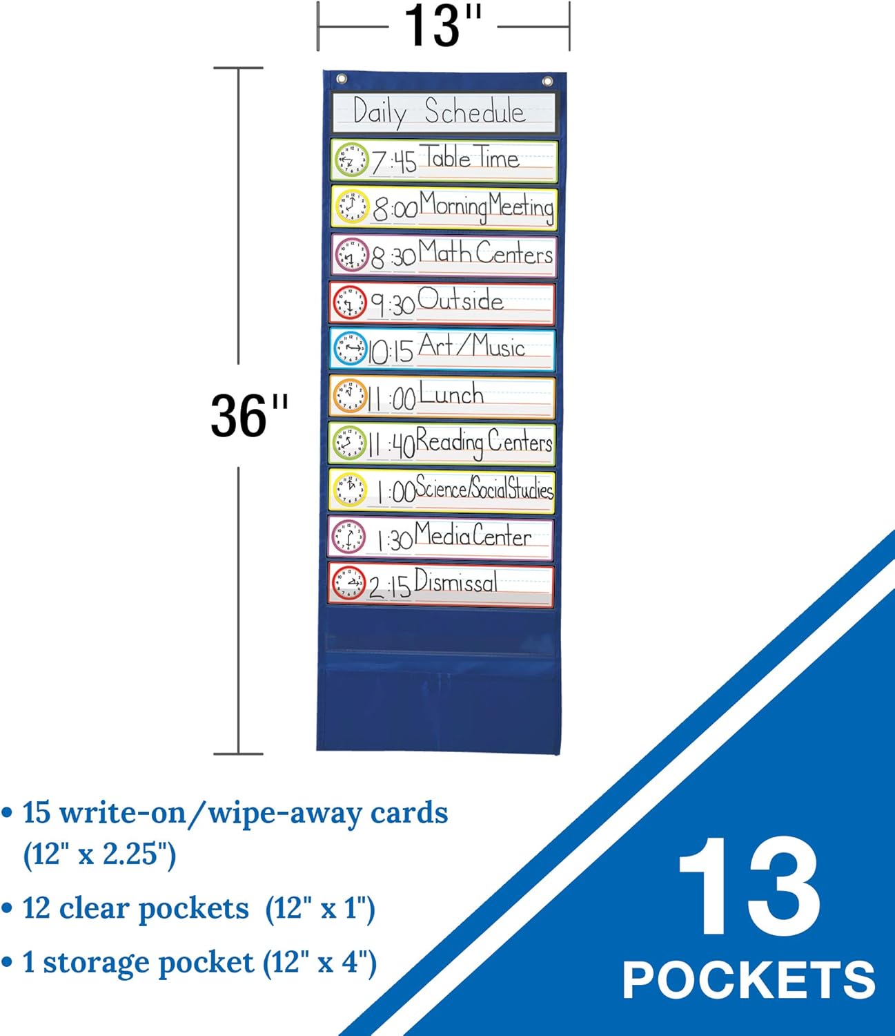 Schedule Pocket Chart Dimensions: The pocket chart measures 13” x 36” with 12” x 1” clear organizer pockets, 12” x 4” storage pocket, and 12” x 2.25” dry erase playing cards. Bolstered grommets dangle your chart on a wall or a delegated stand with ease.
