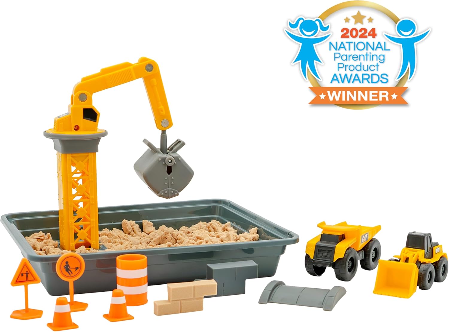 Flip your lounge, sandbox or picnic desk right into a mini development zone with the CAT Dig N’ Construct Filth Playset. Youngsters pour the included 12 ounces of moldable dust into the tray, pack it into the brick and barrier molds, then use the working crane or Little Machines dump truck and loader to haul their creations into place. The gritty, kinetic texture appears like actual soil however wipes up dry, giving younger builders all of the sensory satisfaction with out muddy mess. Every 11-piece set (mannequin 83418) measures a shelf-friendly 9.8 × 2.4 × 8.3 in and weighs simply 1.8 lb, making it straightforward to retailer or take alongside to playdates. True to CAT heritage, each half is constructed to final, and the toy meets security requirements for youngsters 36 months and up. Whether or not it’s a rainy-day living-room construct or a sunny afternoon within the yard, the Dig N’ Construct Filth Playset offers youngsters the instruments to dream, design and dig—many times.