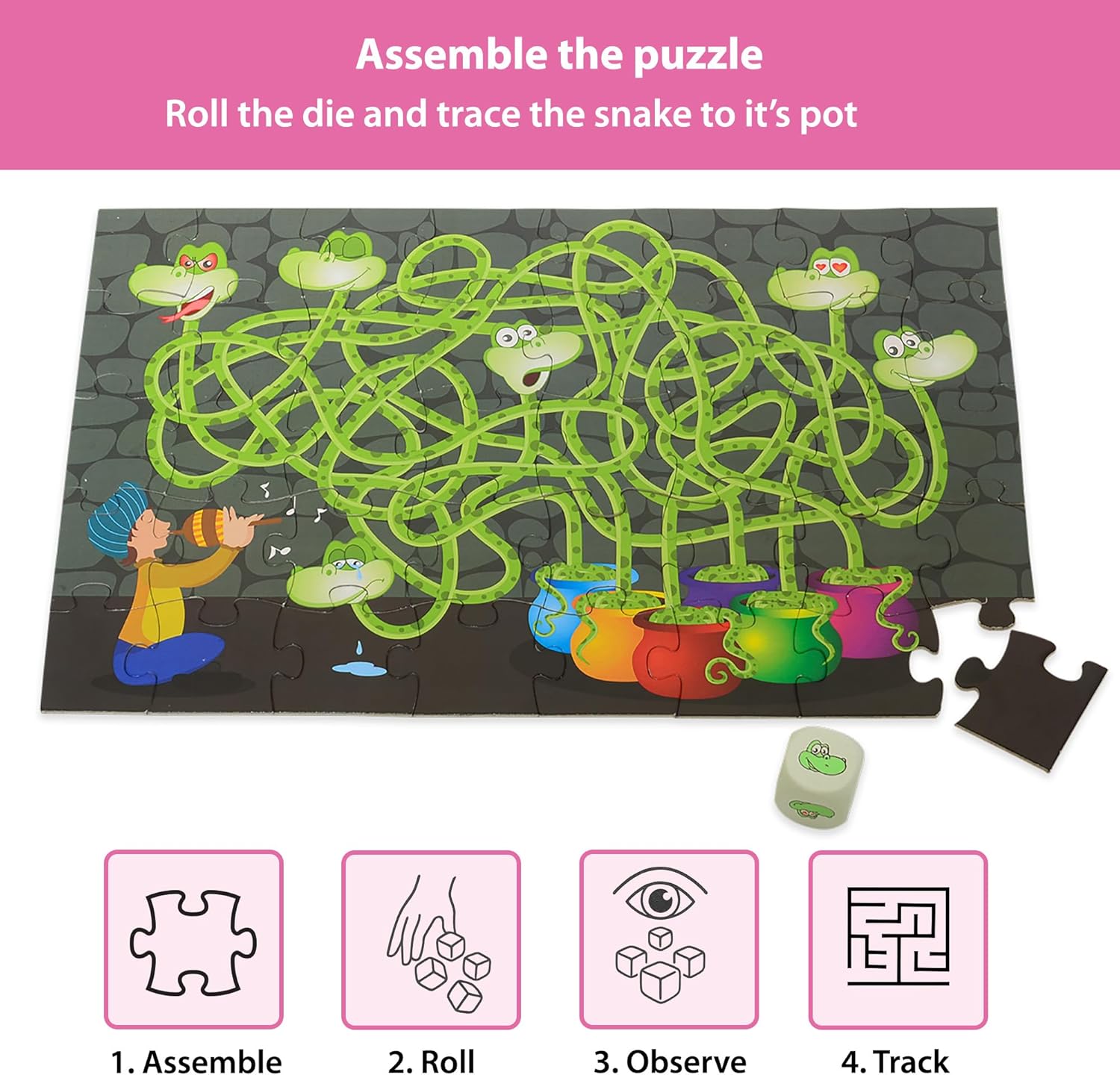 Partaking Puzzle Maze Recreation: Assemble the snake-charming scene and comply with the moody snakes to their pots.