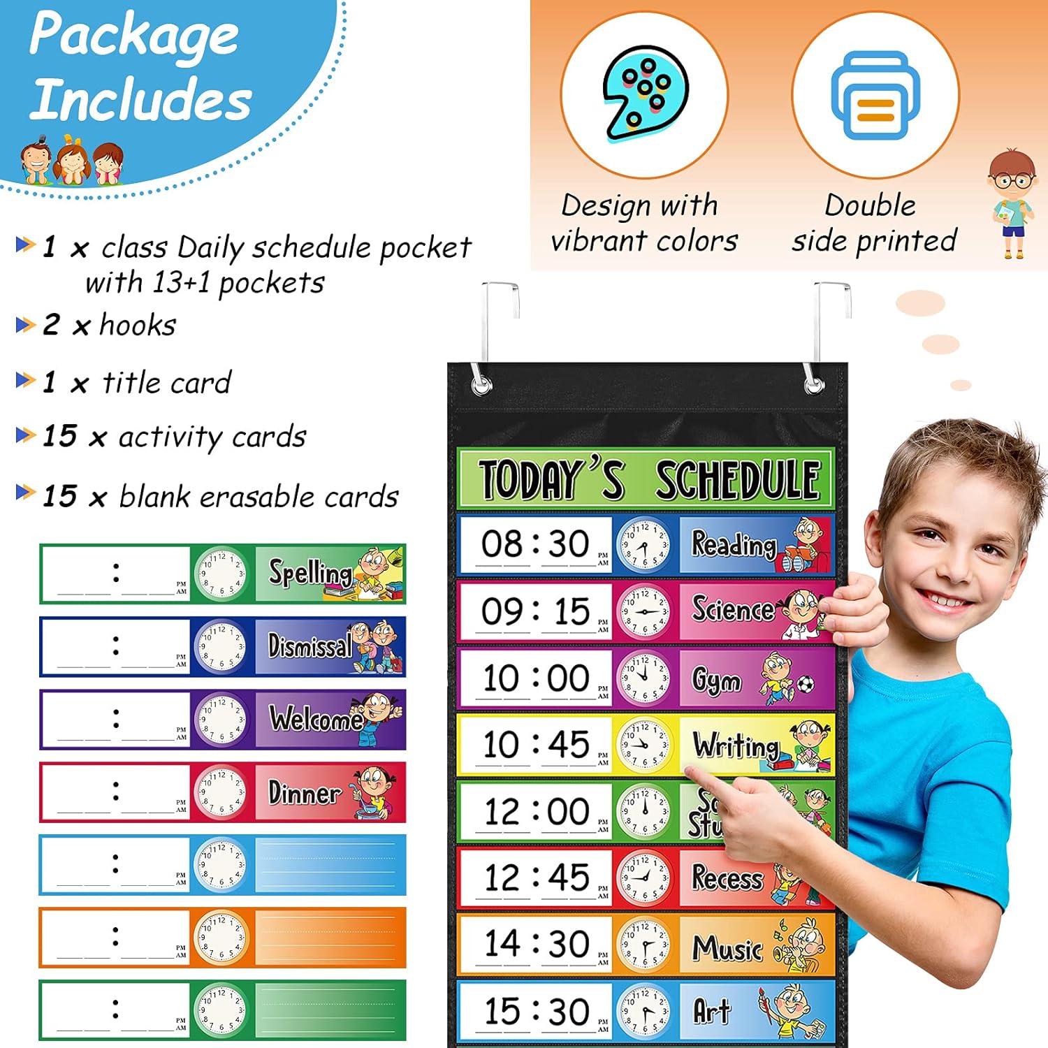 Schedule pocket chart equipment: you’ll obtain 1 piece class schedule pocket with 13+1 pockets, in addition to 2 items hooks, 1 piece title card, 15 items exercise playing cards and 15 items clean erasable playing cards, the again of those playing cards can also be writable and self-filled, which suggests truly you need to use 62 playing cards in whole, simply use them to customise your day and plan by including digital and time to every calendar
