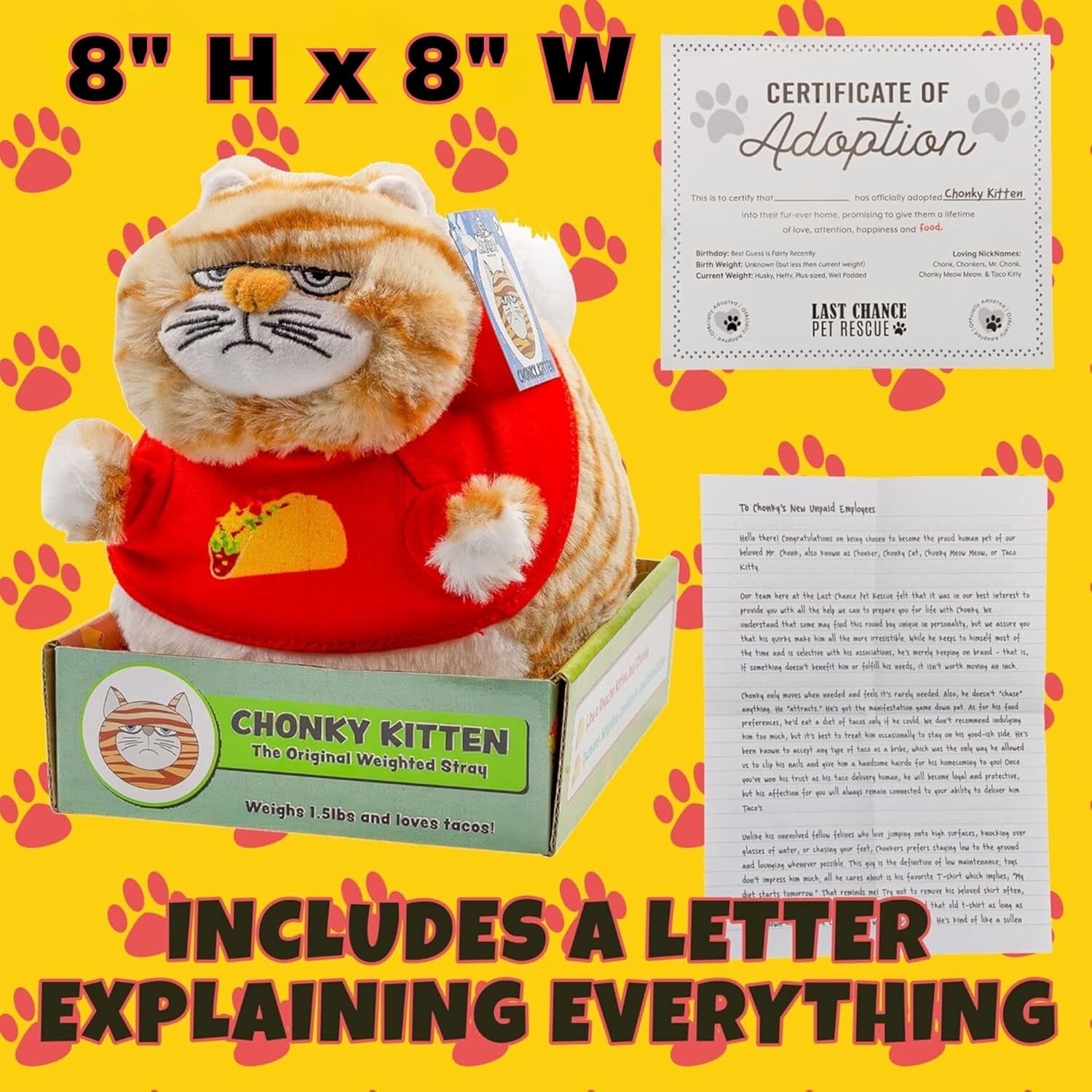 Meet Chonky Kitten, the snack-demanding, belly-dragging plush cat you didn’t know you wanted. This 1.5lb orange tabby is completely spherical, low on endurance, and massive on character. Tender, squishy, and all the time mildly aggravated, he comes together with his signature taco tee and a full adoption information that can assist you survive your time collectively. Whether or not he’s a present, a show piece, or your emotional assist grump, Chonky Kitten is filled with sass—and stuffing.