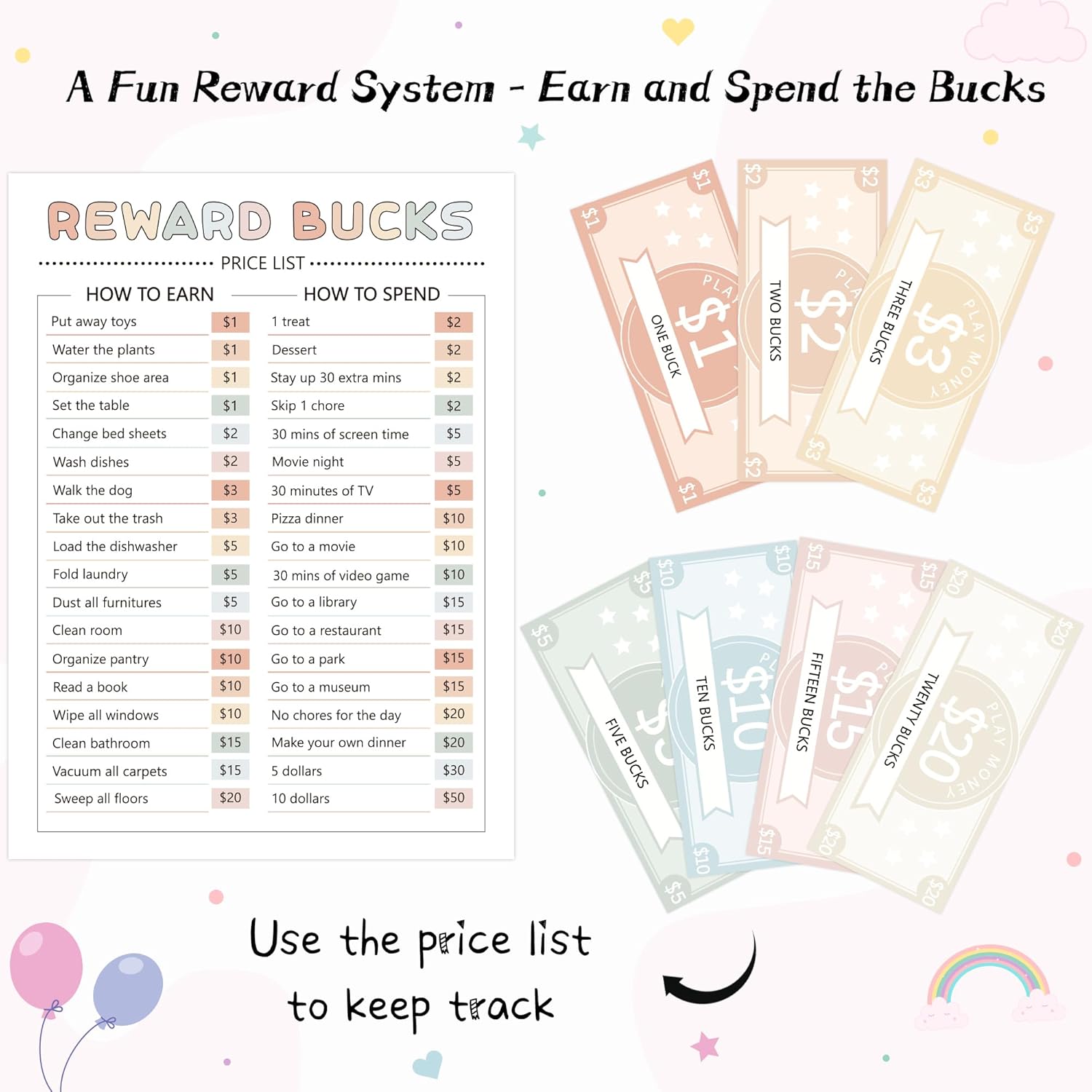 • COcnny Kids Reward Bucks Charts – 633pcs Good Behavior Reward System Chore Chart Bucks List, Prop Play Money Routine Chart Financial Literacy Board Lists Task Schedule Home Visual for Toddles Boy Girl
