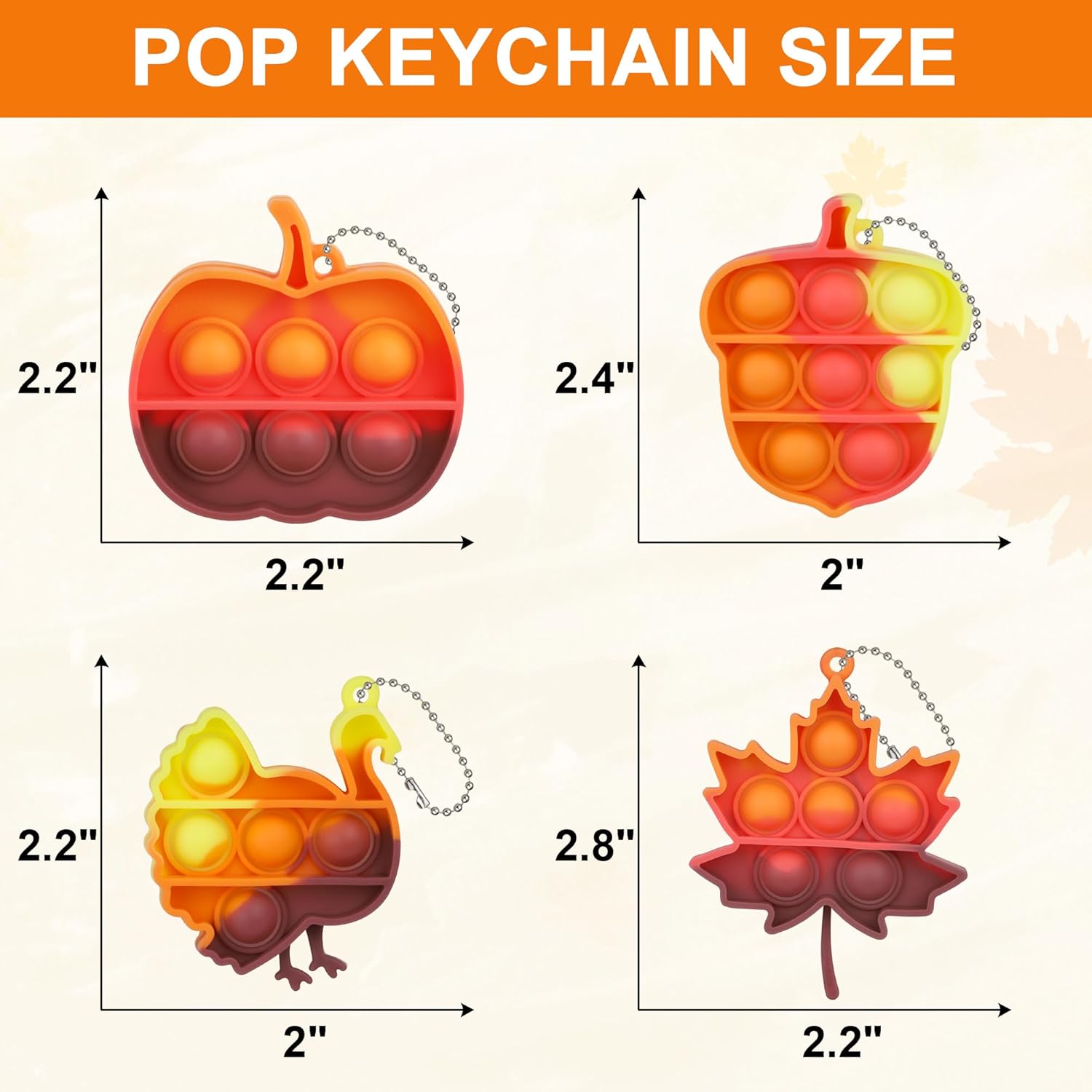 【Fall Celebration Favors】This fall Thanksgiving toy set incorporates 24 pcs mini pop fidget keychains in 4 designs. Options with pumpkin, turkey, fall go away and acorn shapes, these pop fidget keychains end up festive, make them the best fall competition prizes, seasonal birthday presents and thanksgiving get together favors for youths toddlers