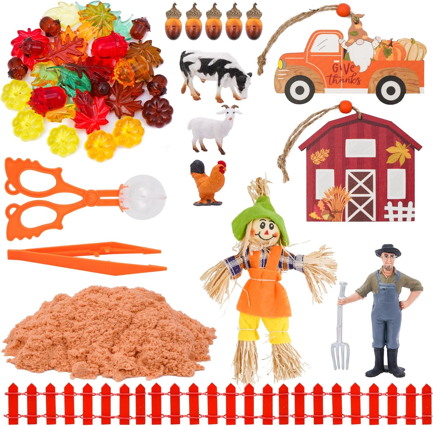 Fall Sensory Bin Set: This fall sensory package features a white plastic storage bin, house sand, a butterfly clip, tweezers, 3 purple fences, a picket home and automotive, farm animal and farmer collectible figurines, 5 acorns, and 15 autumn-themed acrylic items — every part youngsters must create their very own fall farm scene.
