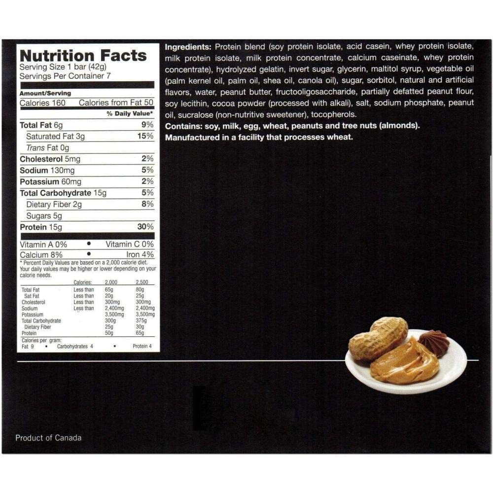 Protein mix (soy protein isolate, milk protein focus, acid casein, whey protein isolate, milk protein isolate, calcium caseinate), hydrolyzed collagen, invert sugar, glycerin, maltitol syrup, vegetable oil (palm kernel, peanut, sunflower), sugar sorbitol, pure and synthetic flavors, fructooligosaccharide, peanut butter, cocoa powder (processed with alkali), water partially defatted peanut flour, soy lecithin, salt, sodium phosphate, tocopherols, sucralose (non-nutritive sweetener).
