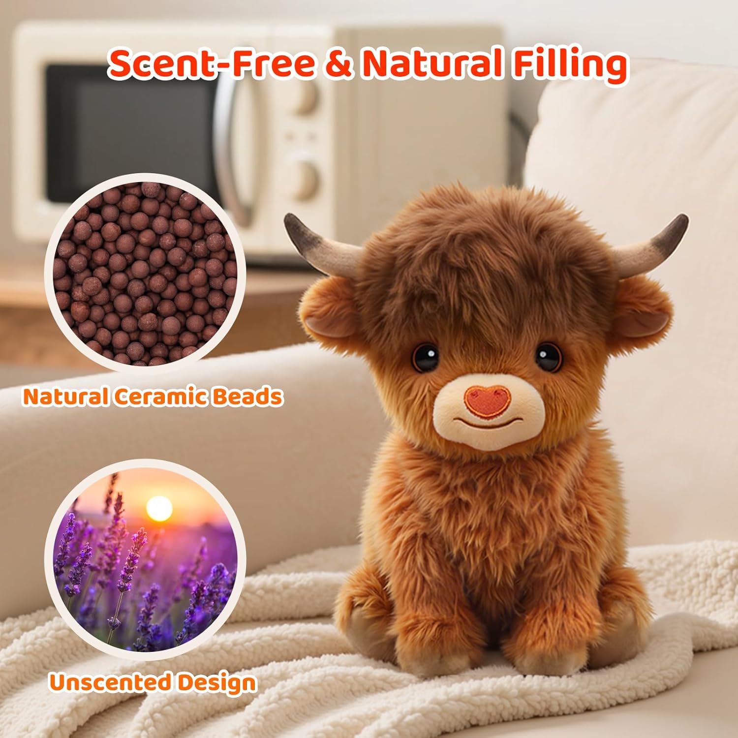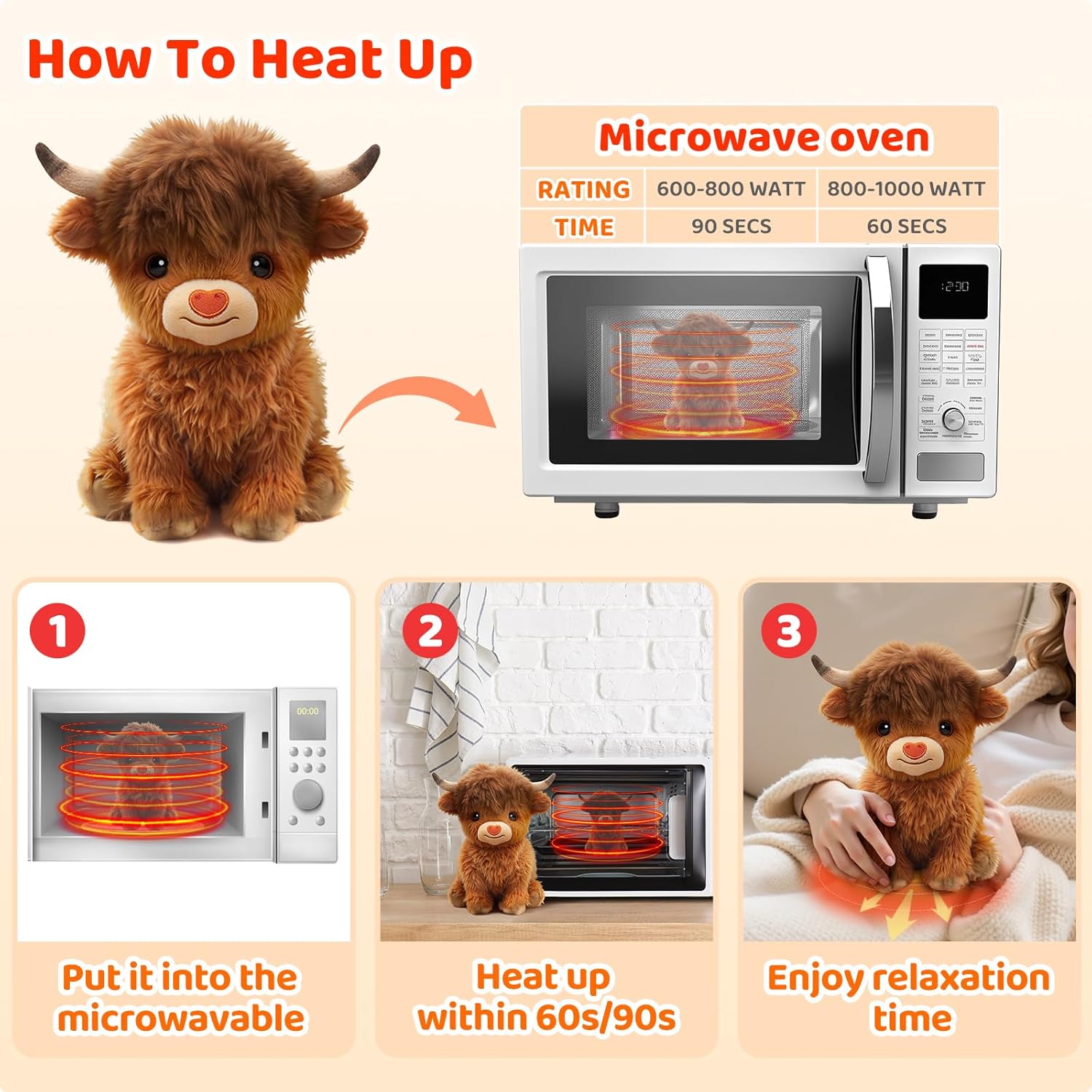 【MICROWAVE-READY WARMTH AND COOLING COMFORT ON DEMAND】: Want soothing warmth or a cooling choice? Merely place this heatable plush within the microwave—90 seconds at 600-800W or 60 seconds at 800-1000W—and luxuriate in as much as 50 minutes of comforting heat. Ultimate for muscle soreness, interval discomfort, or unwinding after a busy day. For cooling consolation, place the Highland Cow stuffed animal within the freezer and luxuriate in refreshing, soothing aid from warmth or rigidity. Get pleasure from final consolation with the flexibleness of warmth and funky remedy, multi functional plush companion.”