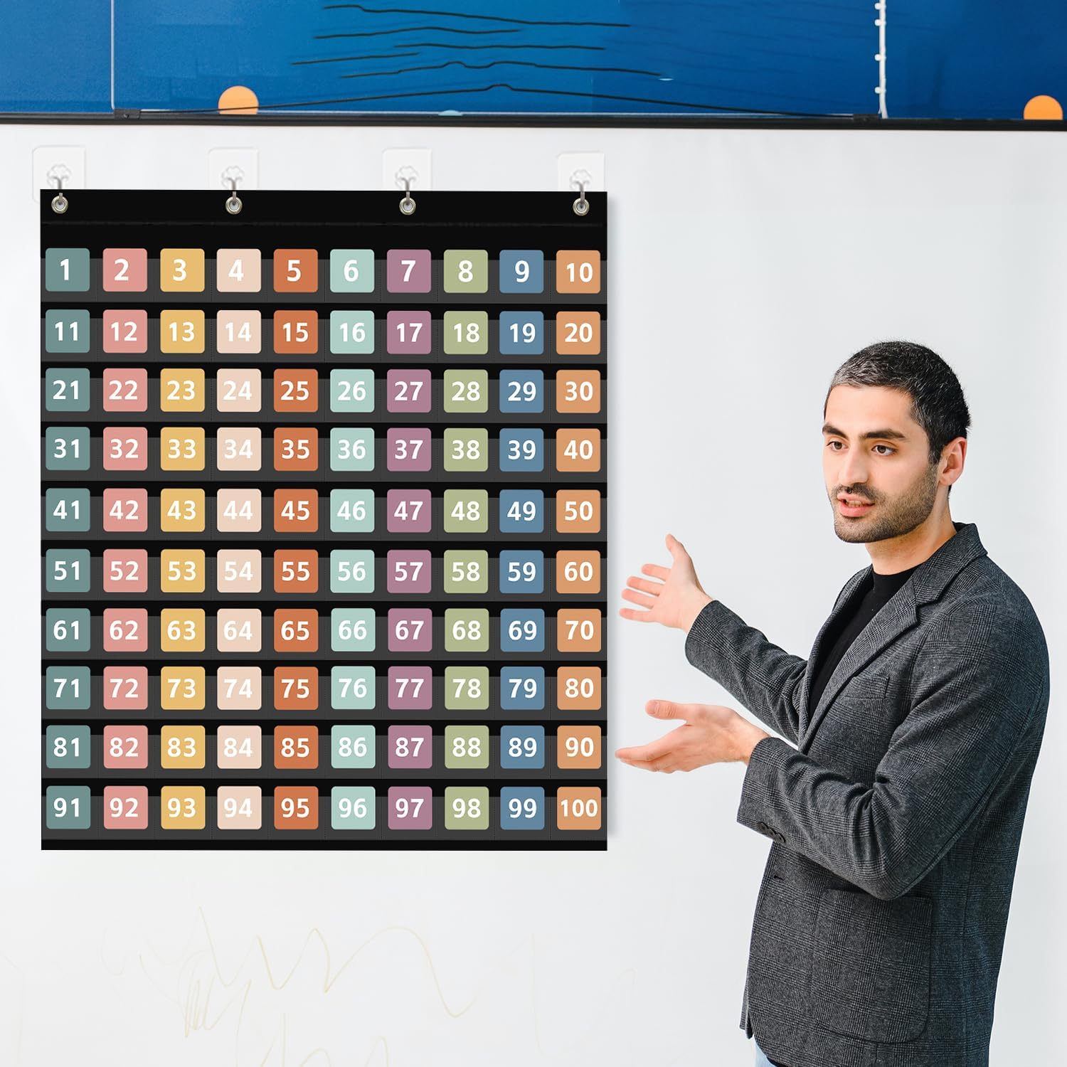 • Hundred Pocket Chart with 100 Pockets and 150 Pieces Boho Double-Sided Number Cards,Number 1-100 Pocket Chart for Kids Classroom Home Counting and Organizer (Black-100 Pockets)