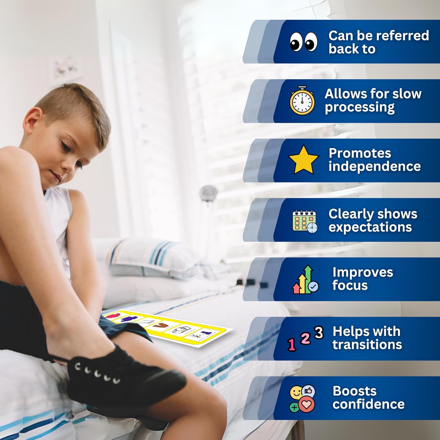 Over time, repeating the identical collection of actions again and again will assist it to develop into routine and finally behavior, step by step lowering the necessity to for assist. Make vital durations of time simpler and stress-free, lowering the psychological power it takes to get by way of the day.