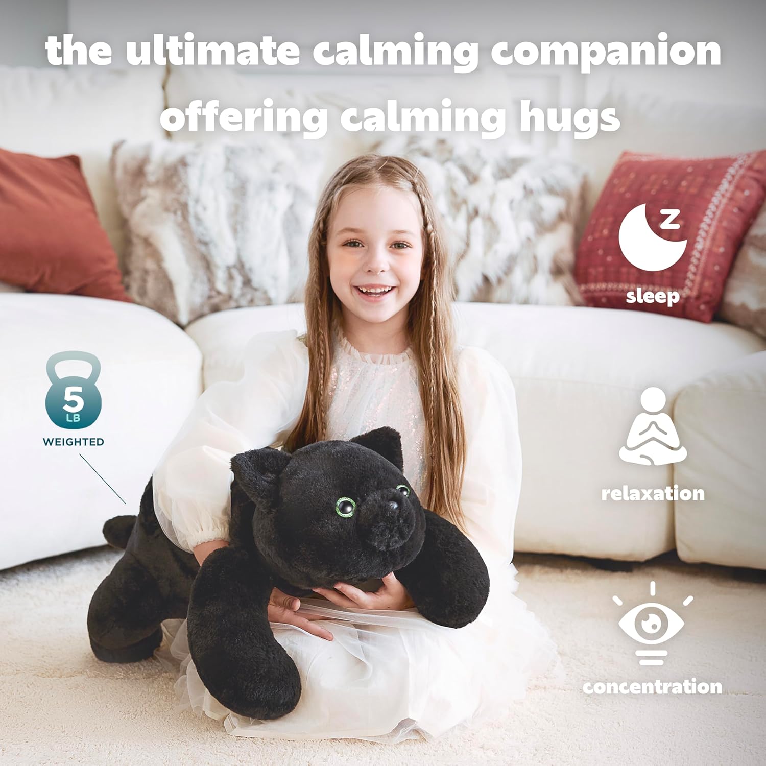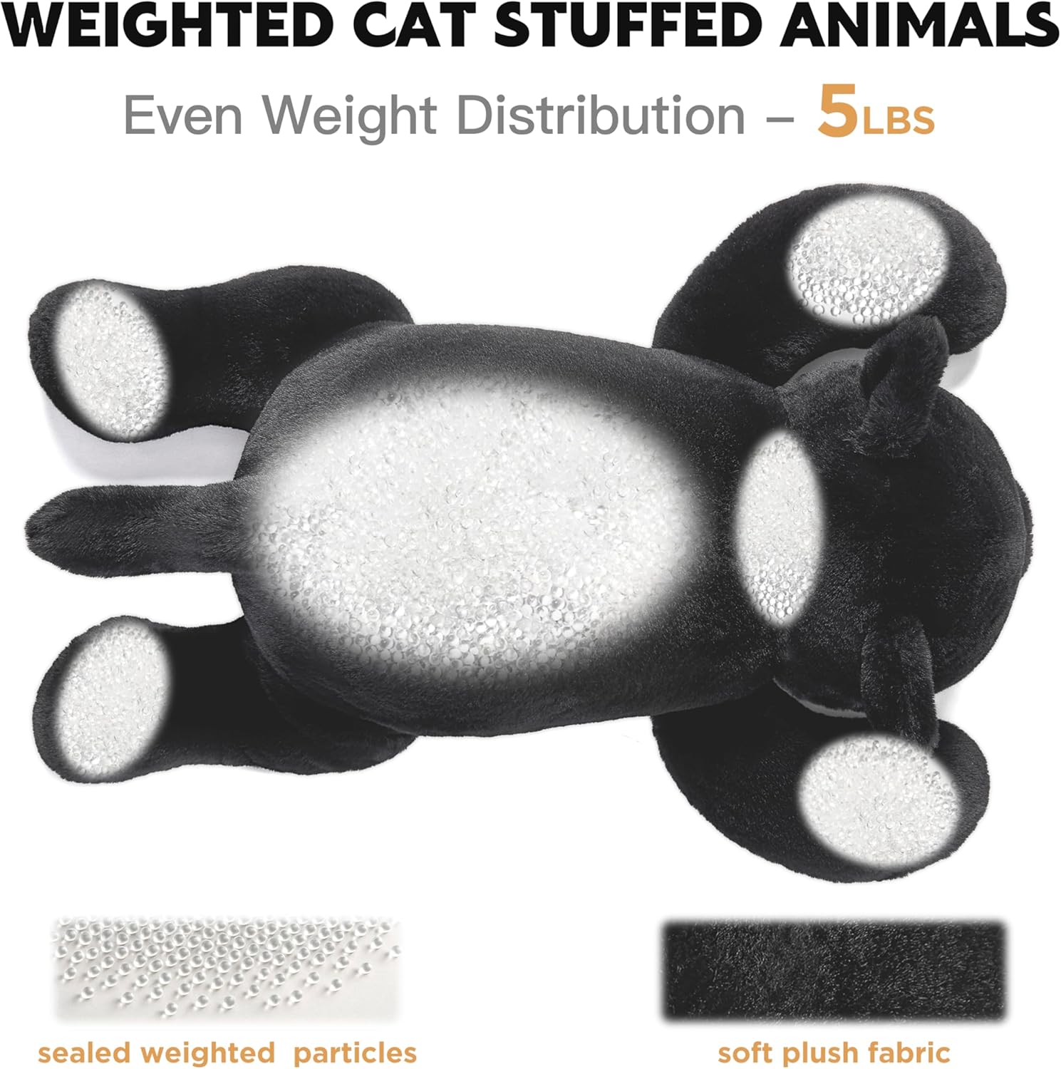 5 lbs weighted stuffed animal: This weighted black cat plush toy measures 24 inches and weighs 5 kilos. It’s crammed with beads to offer a relaxing gravity sensory impact for leisure