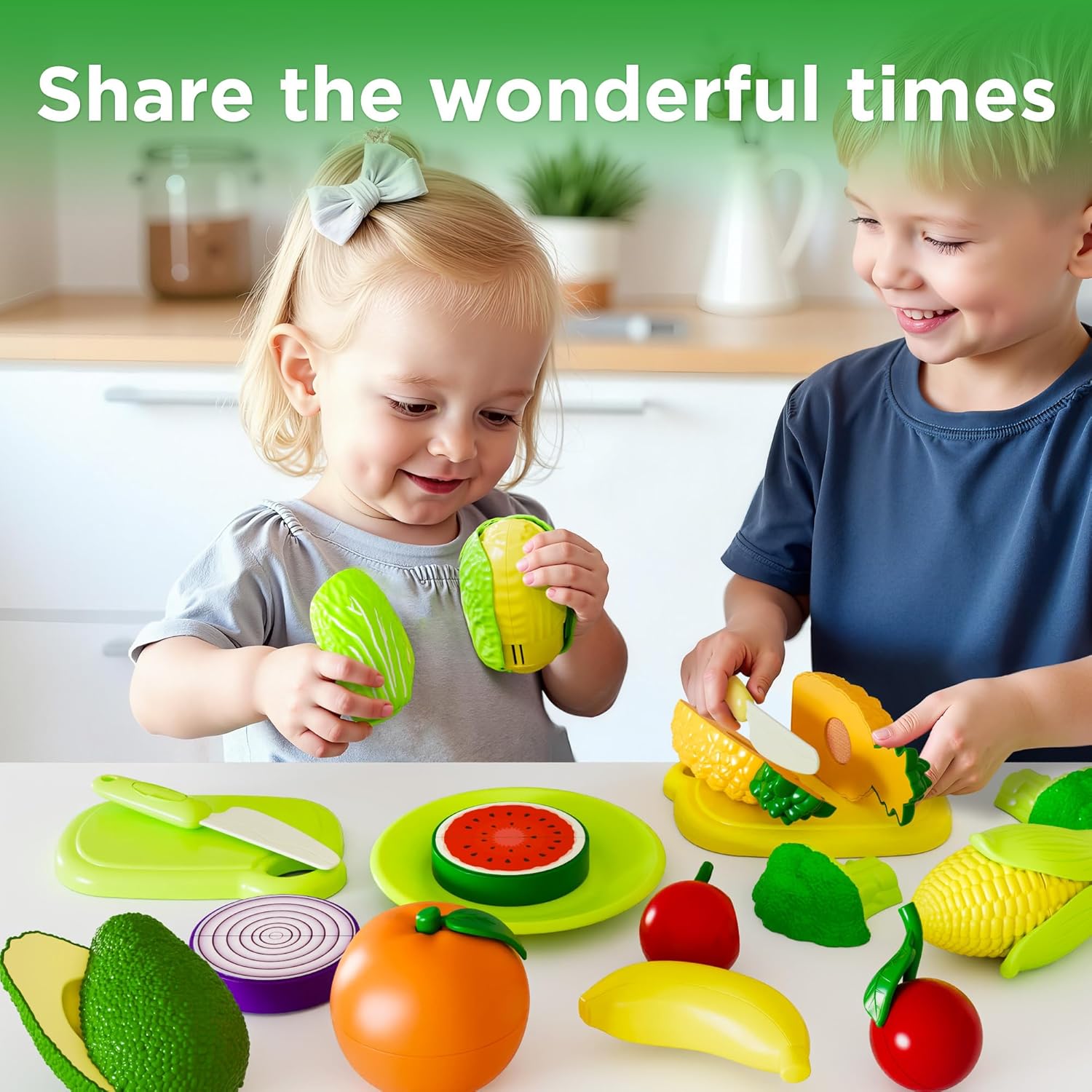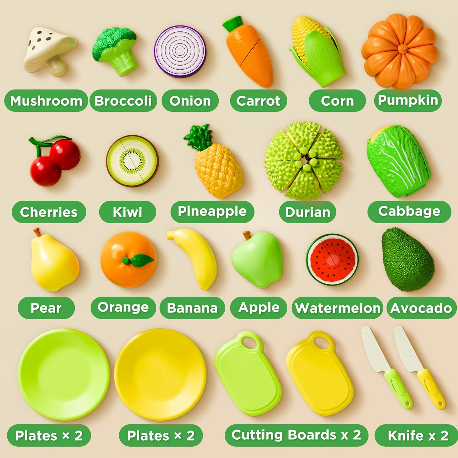 【Toddler Kitchen Play Meals】: 55 items fake play meals toy set for teenagers – Contains 17 totally different sorts of play fruit and greens (might be separated into 54 small items), 29 items facial equipment, an apple storage basket, 2 chopping boards, 2 kitchen knives, and 4 dinner plates.