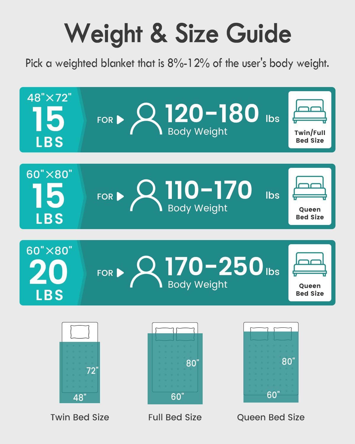 Dimension & Weight Information: Weighted blankets are smaller than common blankets as a result of they’re designed to cowl the physique with out hanging over the mattress’s edge. We advocate selecting a weighted blanket that’s 8%-12% of your physique weight, with inexperienced persons beginning with a lighter possibility.