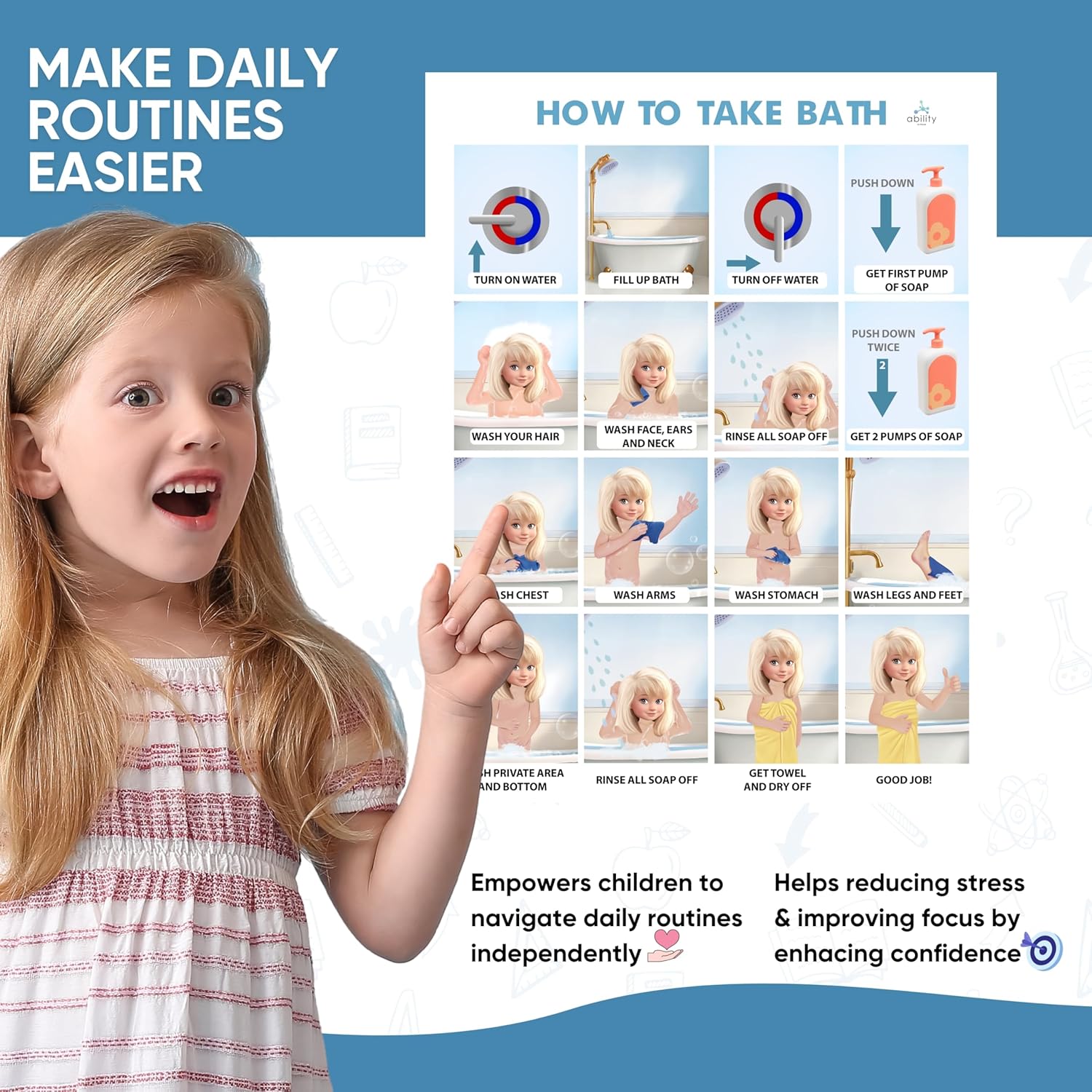 Boosts Hygiene Independence: Straightforward-to-follow bathtub time steps empower youngsters to finish hygiene routines on their very own; this step-by-step bathe routine poster encourages youngsters to comply with self-care duties on their very own; splendid for constructing confidence and autonomy throughout day by day hygiene routines.