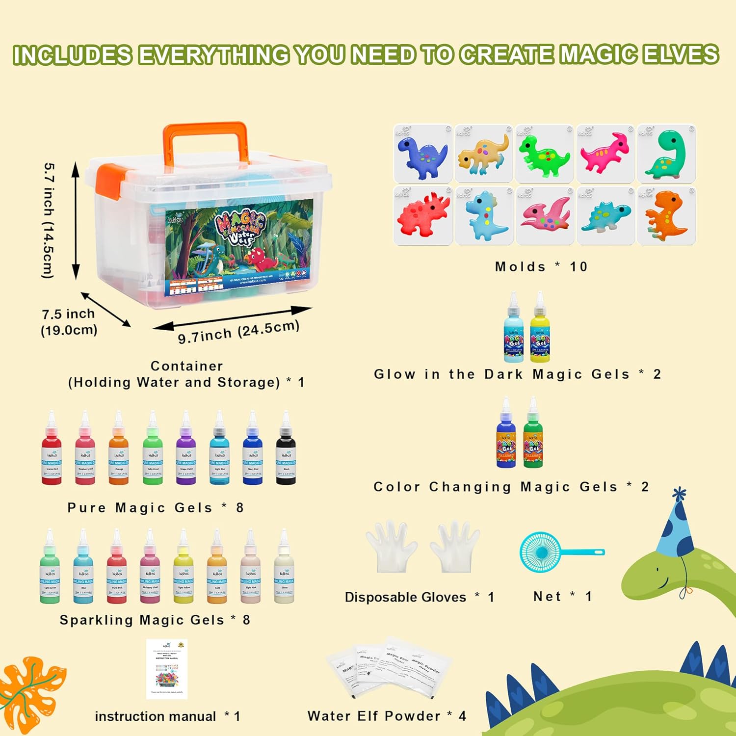 The 20 Dinosaur Colours Magic Water Elf Toy Package consists of 8 pure magic gels, 8 glowing magic gels, 2 glow at the hours of darkness gels,2 coloration altering gels,10 dinosaur molds, 4 packs magic powder, and 1 piece web.