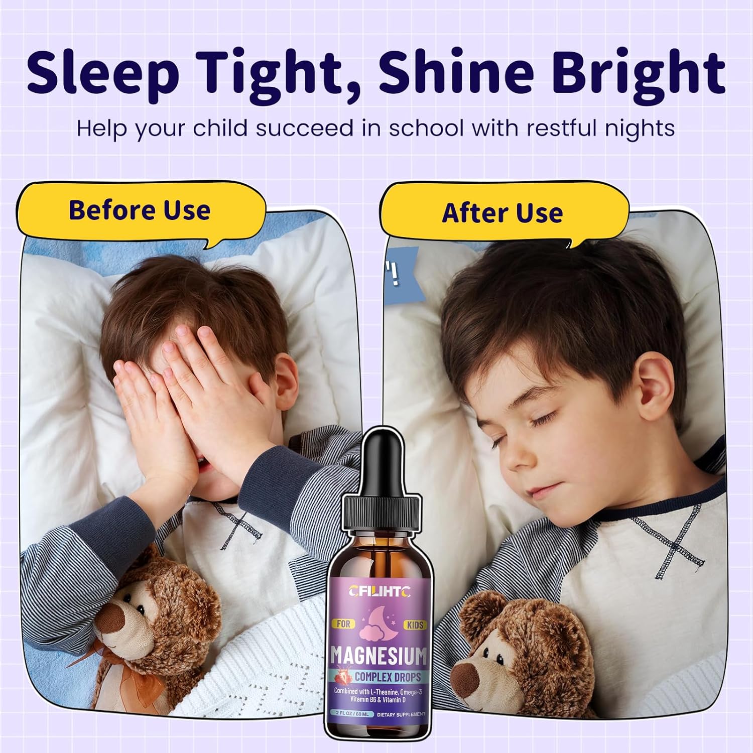 Calm Magnesium Liquid Drops: Our magnesium for youths liquid drops comprise 6 mild elements, together with Magnesium Glycinate, L-Theanine, Omega-3, Vitamin B6 & D3, magnesium glycinate liquid for youths assist promote restful sleep, calm, power, rest, temper, bones & muscle tissue help on your toddler, offering a bodily basis for his or her happiness and exercise