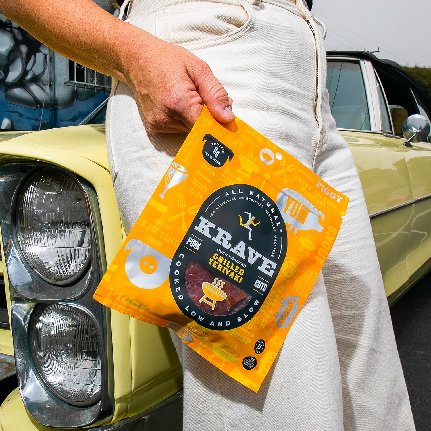 GRILLED TERIYAKI PORK JERKY: Heed the roar of the boar with tender slices of pork infused with our candy and tangy teriyaki sauce.