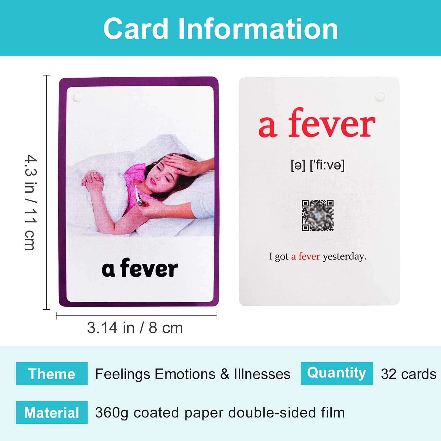 Primary Info:1. Theme of Playing cards: Emotions Feelings & Sickness.2. Handheld dimension 4.3 X 3.14 inch, 11 X 8 cm.3. 360g whiteboard paper, double sided movie, waterproof.4. HD photos and instance sentences deepen the reminiscence of phrases. This can be a instrument for enlightening English studying.Observe:1. As a result of gentle and display screen setting distinction, the merchandise’s shade could also be barely completely different from the images.2. Please permit a slight dimension distinction resulting from completely different handbook measurements.3. The opening and shutting of the metallic ring is laborious, youngsters are forbidden to function, please function by adults. [Learning Cards] These are double-sided printed playing cards. The entrance of the cardboard is a HD image and the phrase, the again of the cardboard is a QR code and a sentence containing the phrase. You may get the pronunciation of the sentence by scanning the QR code.[Comfortable Handheld Size] The dimensions of every card is 4.3 X 3.14 inch, 11 X 8 cm. This can be a appropriate hand-held dimension for toddlers and kids. The small dimension is straightforward to hold and retailer. This can be a instrument that youngsters can be taught and play anytime and wherever, whether or not indoors, outside, or within the classroom.[Waterproof Material] 372g whiteboard paper, double-sided movie, waterproof, anti-folding and fillet processing with out scratch, reused.[Features] HD actual pictures photos actually and clearly categorical the which means of phrases, make youngsters concerned about English playing cards, assist youngsters memorize phrases rapidly, accumulate extra vocabulary, and grasp English abilities. Playing cards are multi-purpose, studying toys, classroom group and ornament, instructing actions, presents, video games. Appropriate for toddlers, youngsters, preschoolers, and homeschoolers. Playing cards are the perfect instrument for enlightening English studying, good helper for lecturers and fogeys.[Easy to Organize] The packaging of playing cards include a metallic ring, which may simply retailer and arrange the playing cards.
