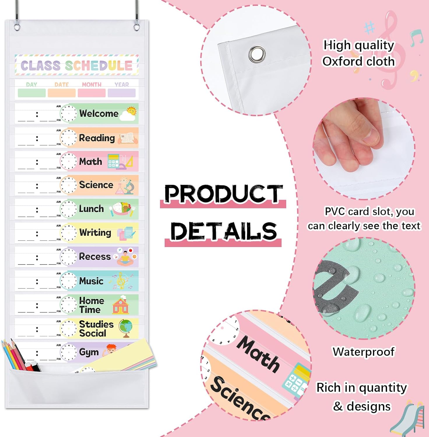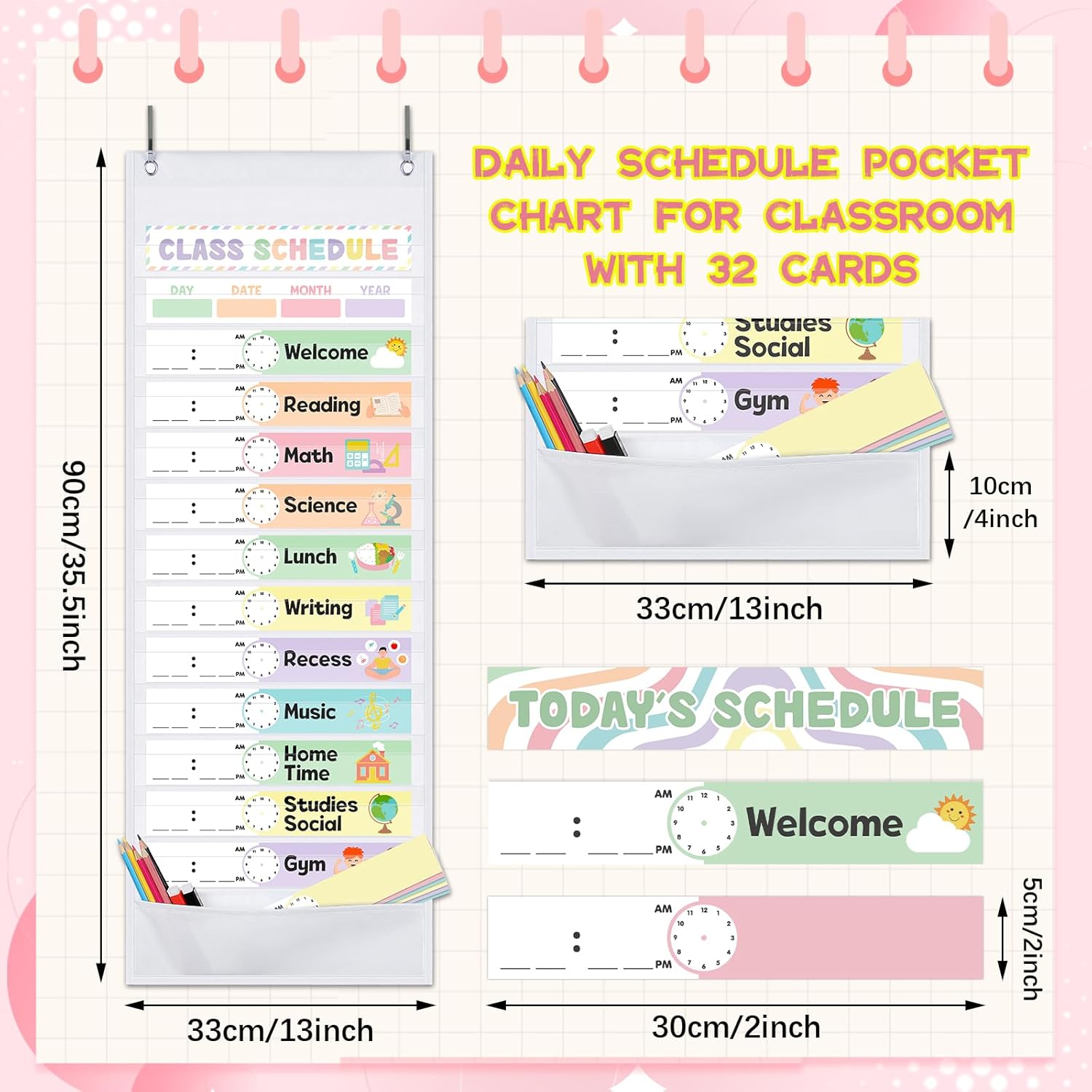 Pastel Daily Schedule Pocket Chart kit, 13+1 Pocket Schedule Chart with 32 Pieces Reusable Cards Visual Scheduling Pastel Classroom Essentials for School Office Home Preschool Activity