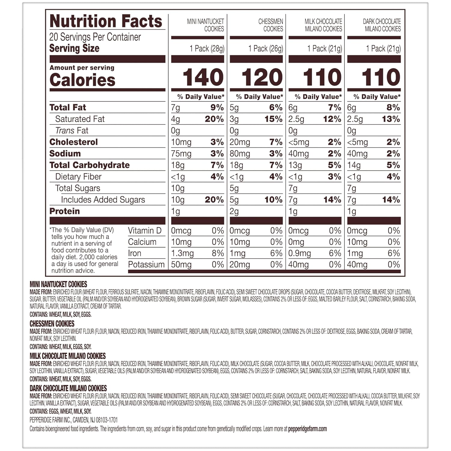 Contains one (1) field of 20 snack packs of Pepperidge Farm cookies