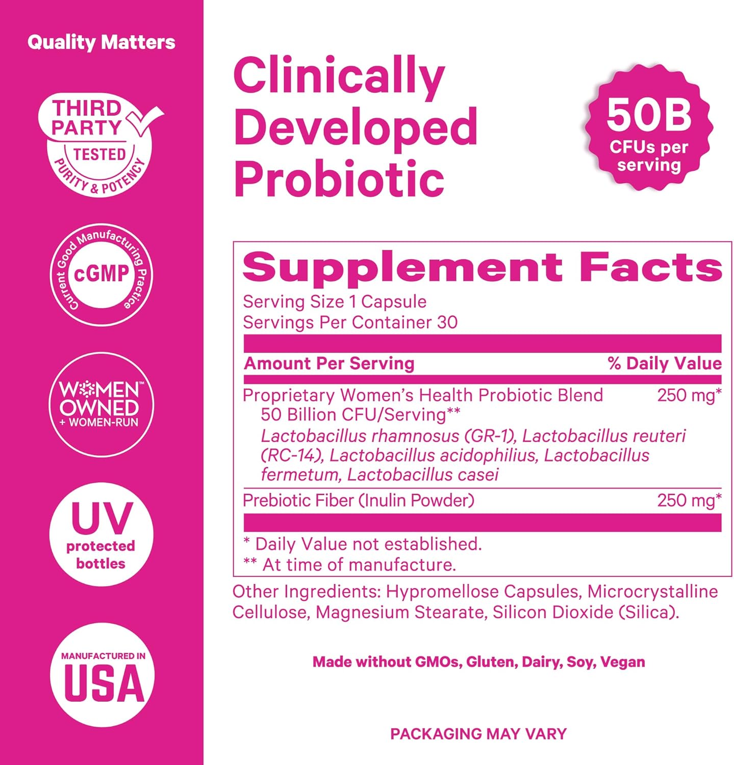 Complete Digestive + Vaginal Wellness Help: Crafted with a potent 50 Billion CFU mix of Lactobacillus + Bifidobacterium strains — together with L. rhamnosus, L. acidophilus, and L. reuteri — this formulation helps the stability of vaginal flora and digestive well being. Designed to assist with occasional bloating and to advertise wholesome intestine operate, it additionally helps female pH stability.