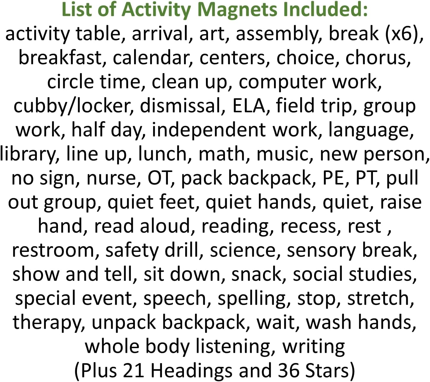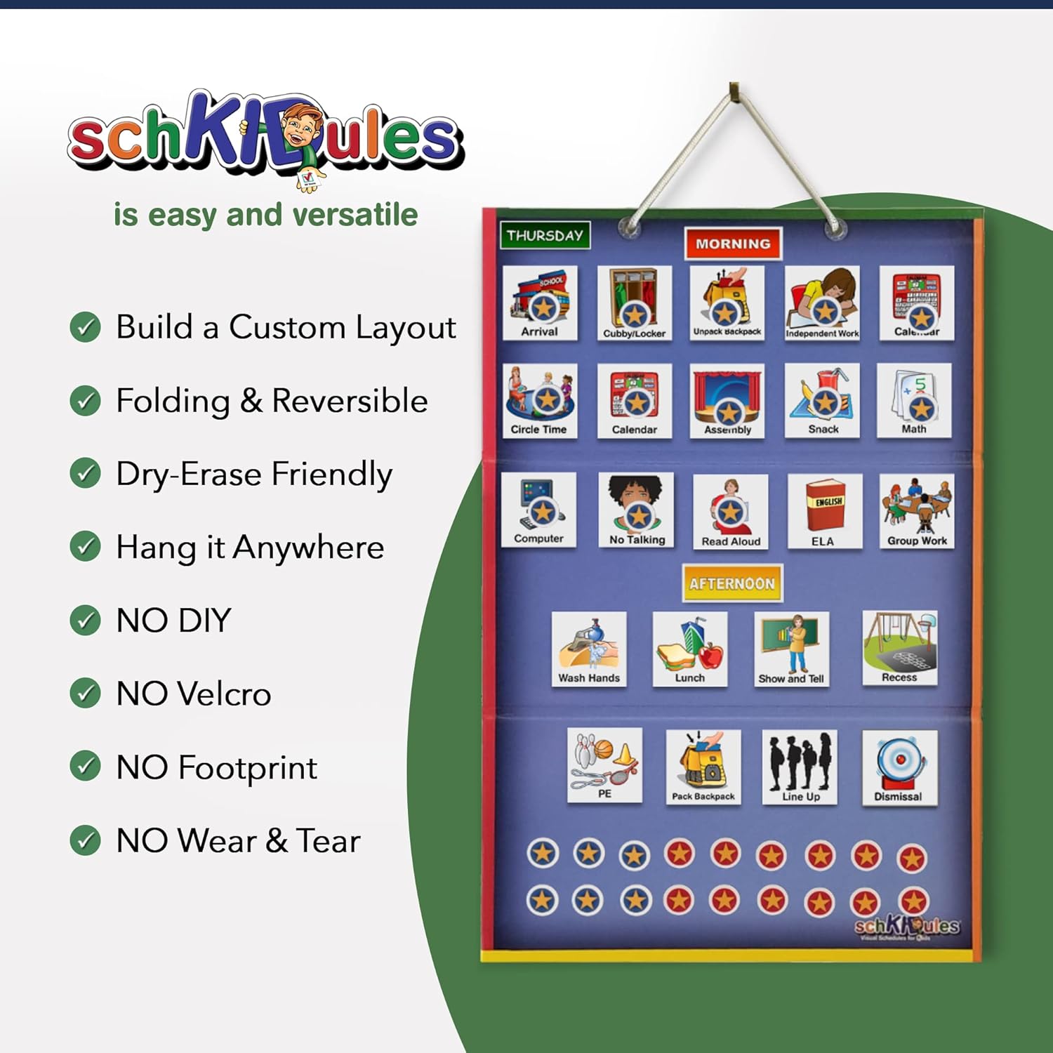 SchKIDules Schooling Bundle Options (1) Two-Sided 18” Tri-Folding Board, 66 2×2 College And Particular Schooling Exercise Magnets, 21 Headings Magnets And 36 Star Magnets For A Full Answer To Your Day by day And Weekly Visible Schedule Wants.