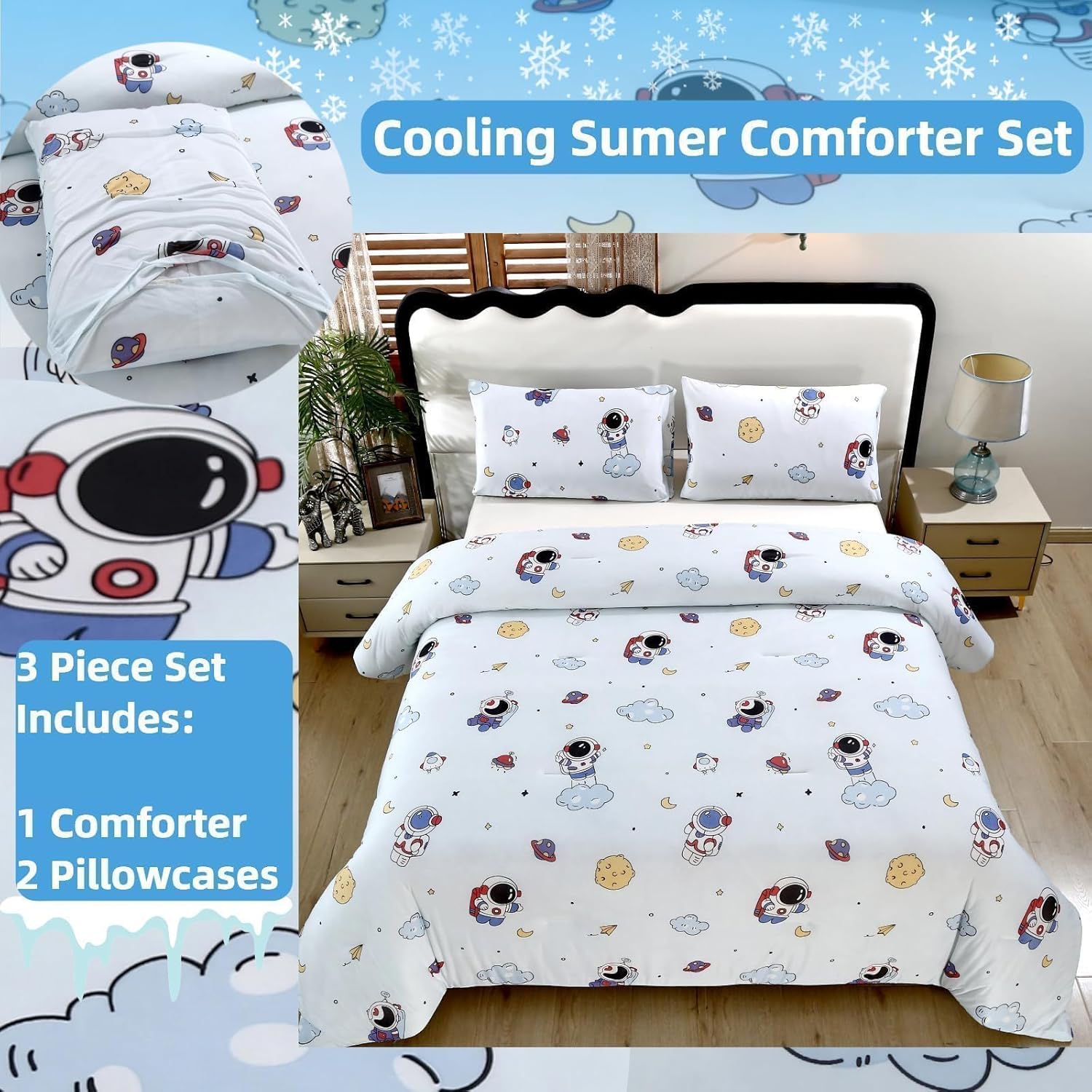 3 Piece Set: The cooling twin comforter set astronaut patterned consists of 1 comforter (69”*90”) + 2 pillowcases (20”*30”).