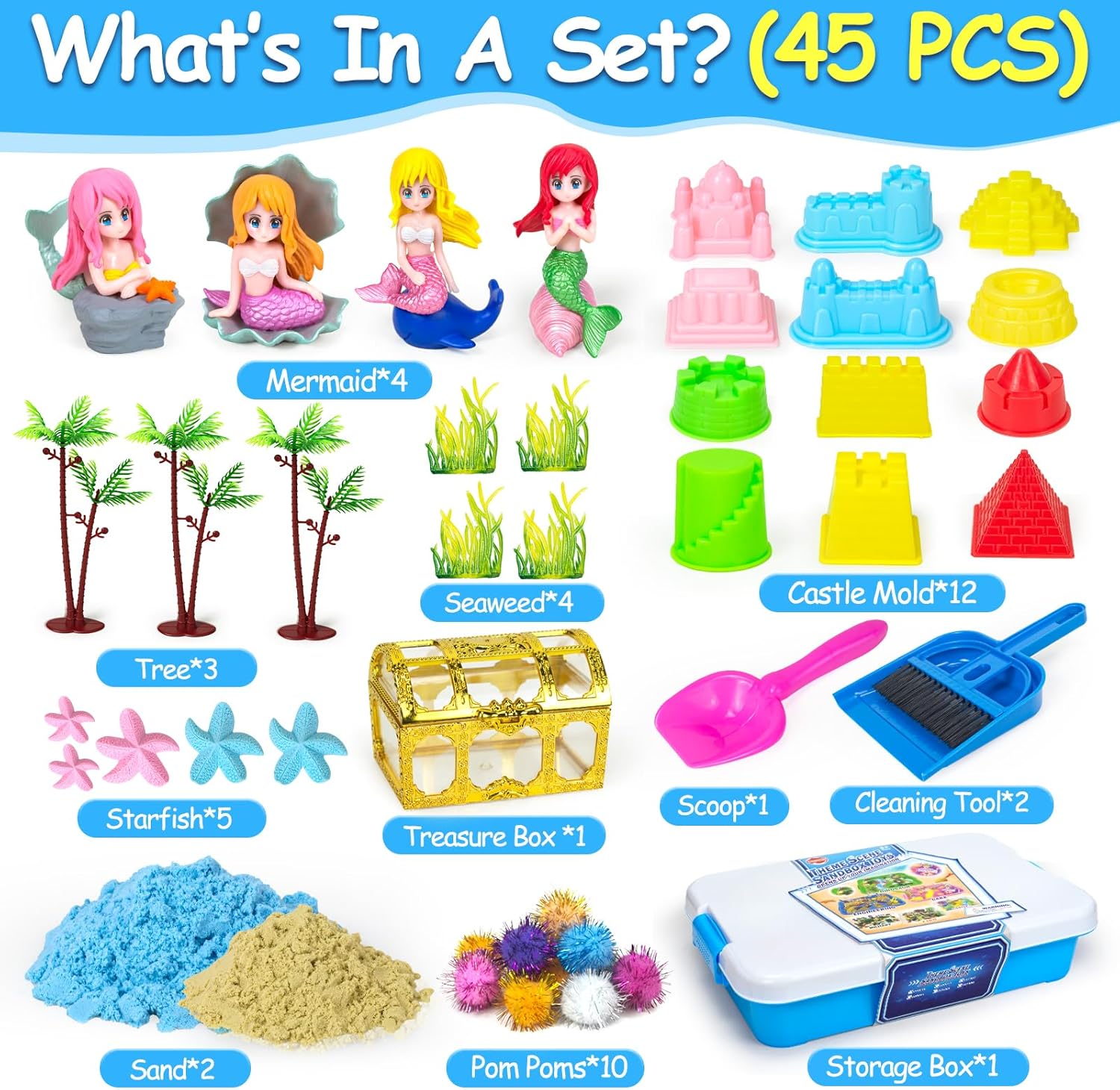 AMAZING SENSORY BIN TOYS: Our full mermaids sand play set features a stunning storage field, 2 colours of sensory sand, 4 collectible figurines, 12 citadel molds, 3 sand play instruments, and plenty of ornamental equipment together with starfish, pom poms, balloons and extra. The various fillers enable youngsters to significantly make the most of their creativeness and creativity to create a ocean world of their very own!
