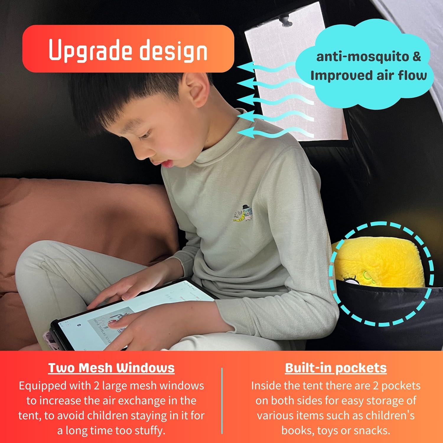 The upgraded design of the sensory tent contains two mesh home windows on each side to reinforce airflow, forestall mosquitoes, and permit for protecting when not in use.