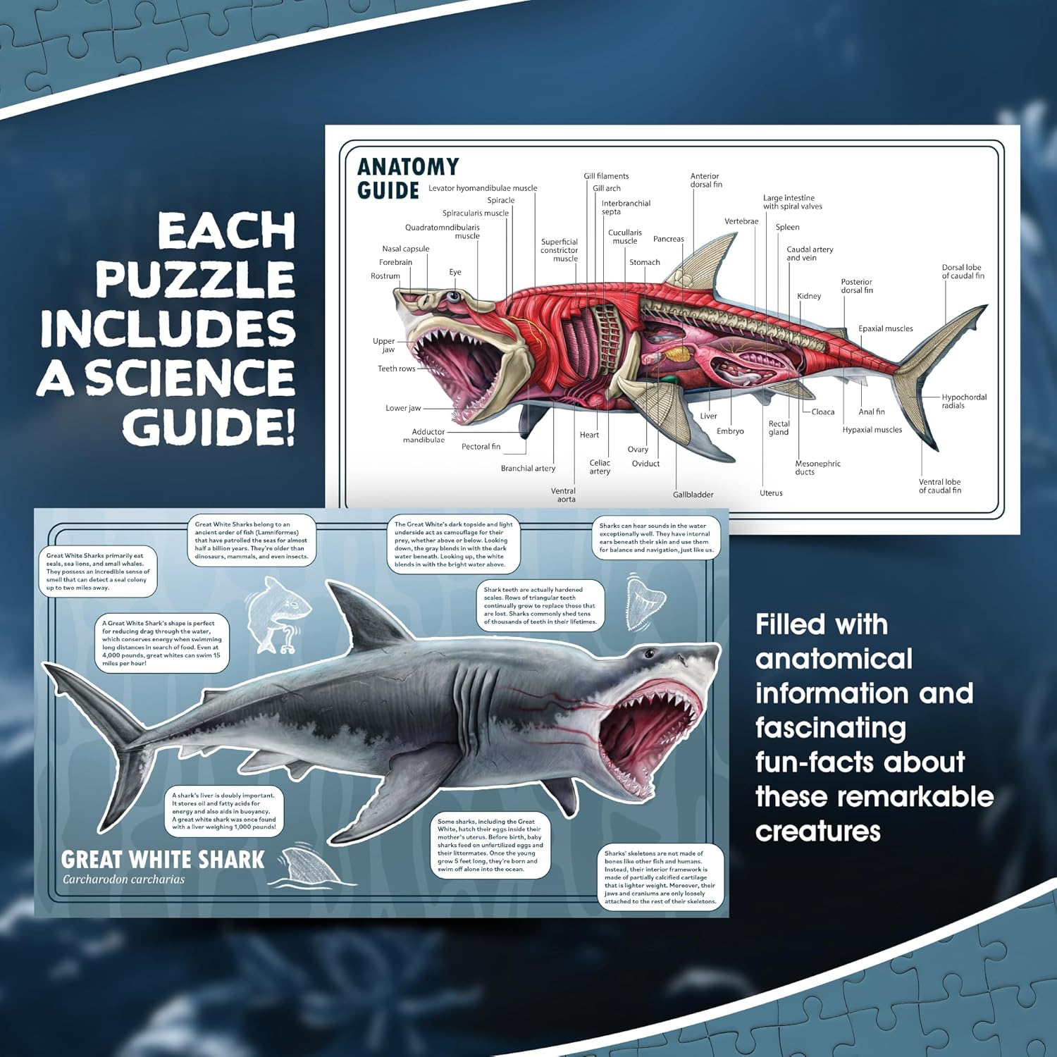 DOUBLE SIDED DESIGN: This Shark Animal jigsaw puzzle boasts a novel double-sided design. On one facet, you will discover beautiful paintings of the Nice White Shark, a supreme predatory fish that patrols all main oceans’ coasts, consuming halibut, dolphins, seals, and sea lions. On the opposite facet, you will uncover a scientifically-accurate reconstruction of the animal’s anatomy. This dual-sided strategy provides each aesthetic appreciation and academic worth, making it a flexible studying software.