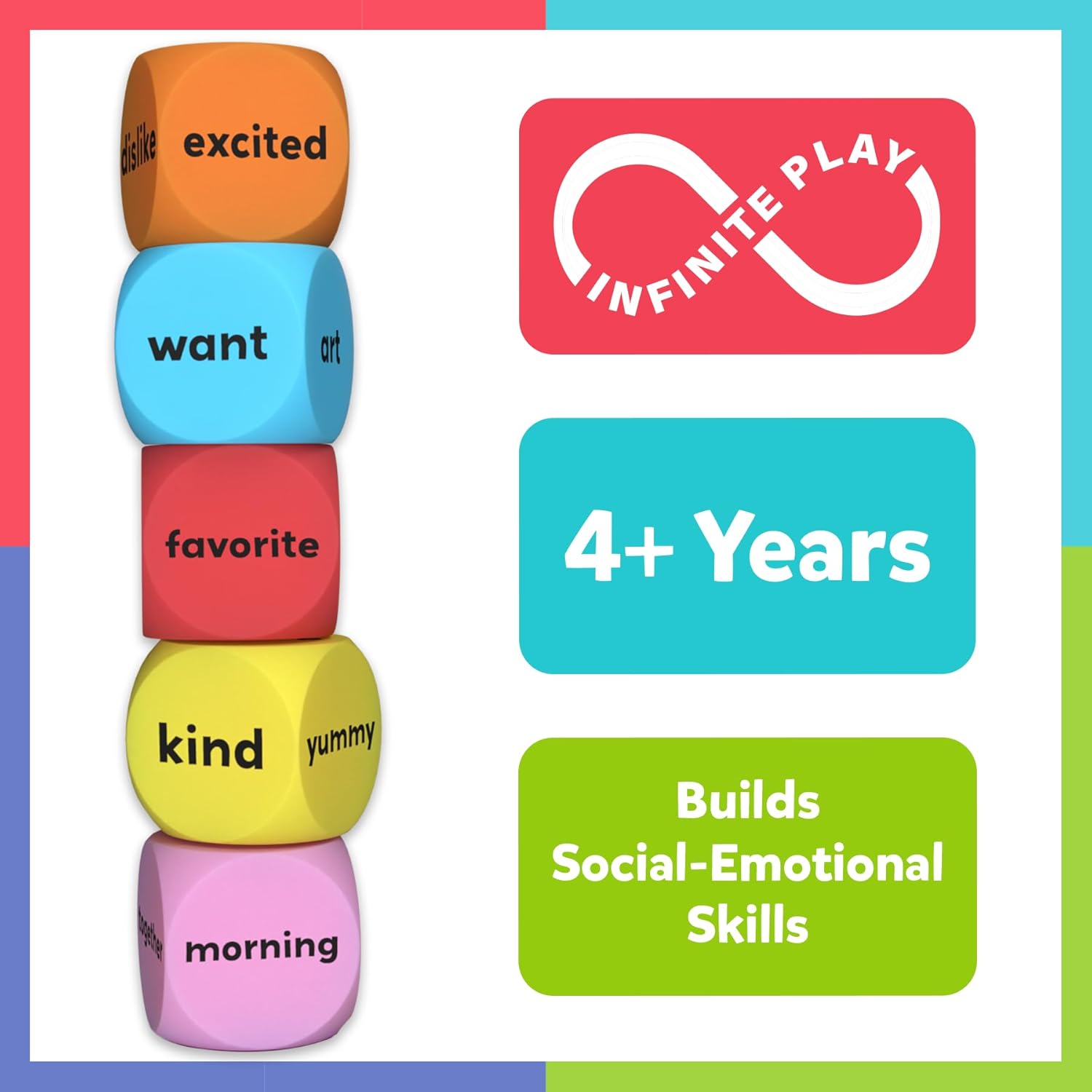 These cubes characteristic phrases as an alternative of questions, encouraging youngsters to specific themselves, spark creativity, and revel in infinite open-ended play!
