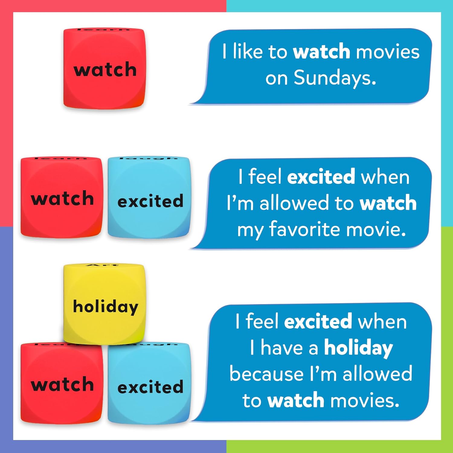 INCLUDES: 8 Foam Dialog Cubes (1.2” every) that includes 48 phrases, plus a Studying Information.