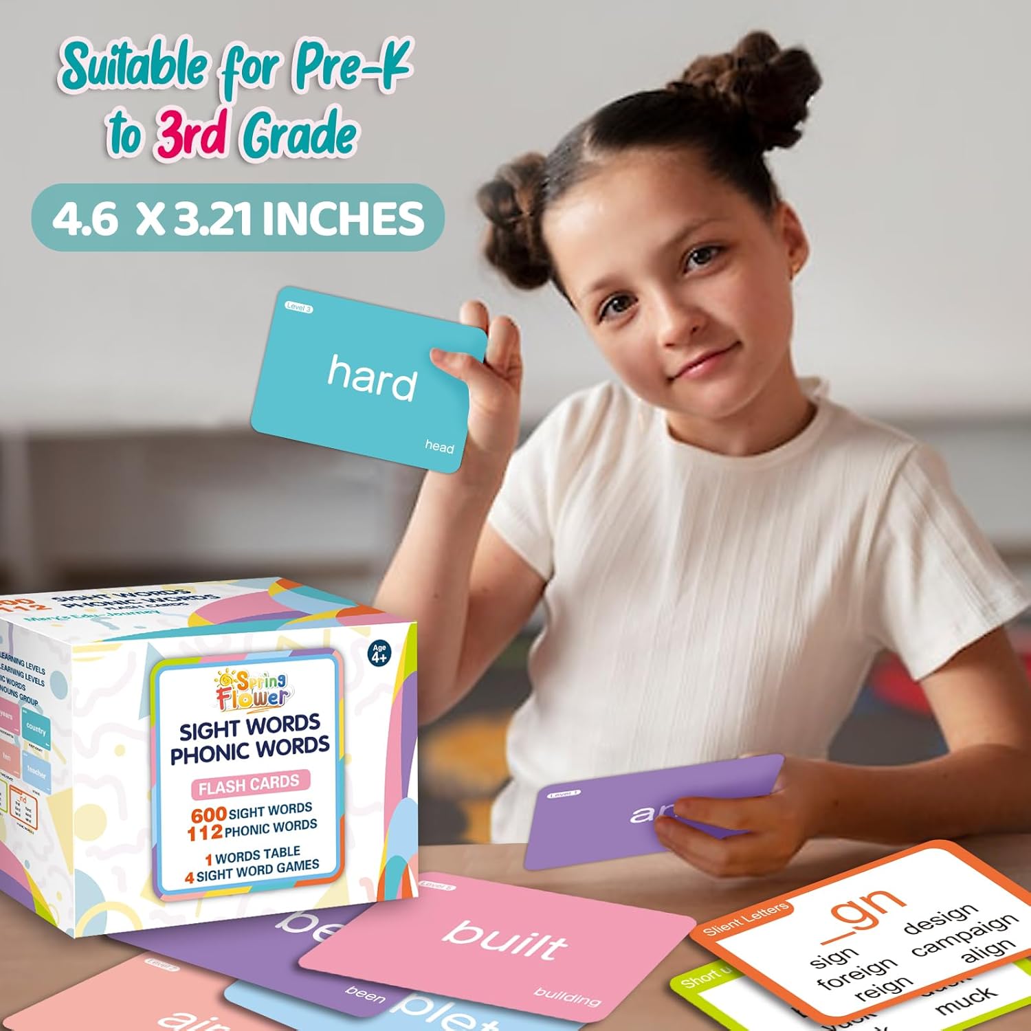 SpringFlower 712 Sight Words Flash Card,600 Dolch & Fry High Frequency Sight Word,112 Phonic Flash Cards for Kindergarten Homeschool Supplies Games for Kids Pre-K, Kindergarten, 1st, 2nd, 3rd Grade