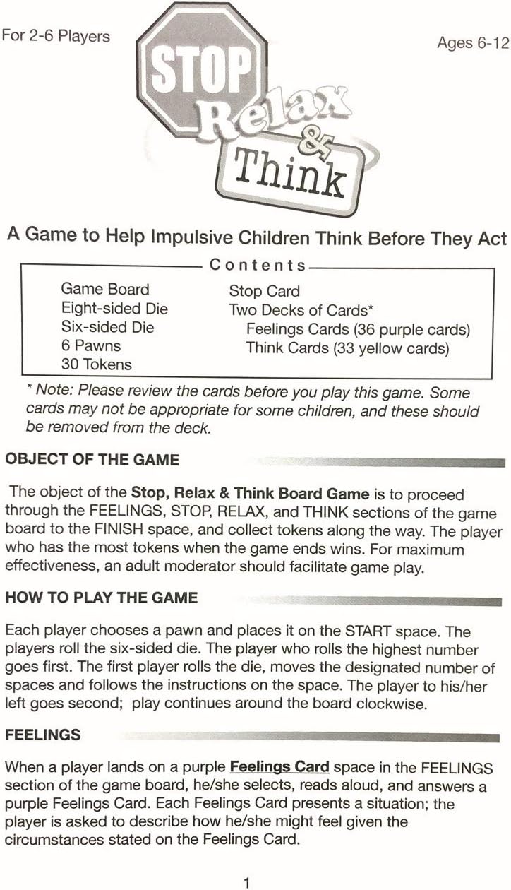 Ages 6-12. By Becky Bridges, C.S.W., A.C.P. A recreation to assist impulsive kids suppose earlier than they act. On this ever-popular board recreation, lively, impulsive kids be taught motor management, rest abilities, find out how to categorical their emotions, and find out how to problem-solve. The handbook contains data on how the sport can be utilized each as a diagnostic and a remedy instrument, and the way behaviors realized within the recreation may be generalized for the house or classroom. The item of the sport is to proceed by means of the Emotions, Cease, Calm down, and Suppose sections of the sport board to End, accumulating chips alongside the best way. The participant with essentially the most chips when the sport ends wins. Designed for counselors, social staff, therapists, and different serving to professionals.
