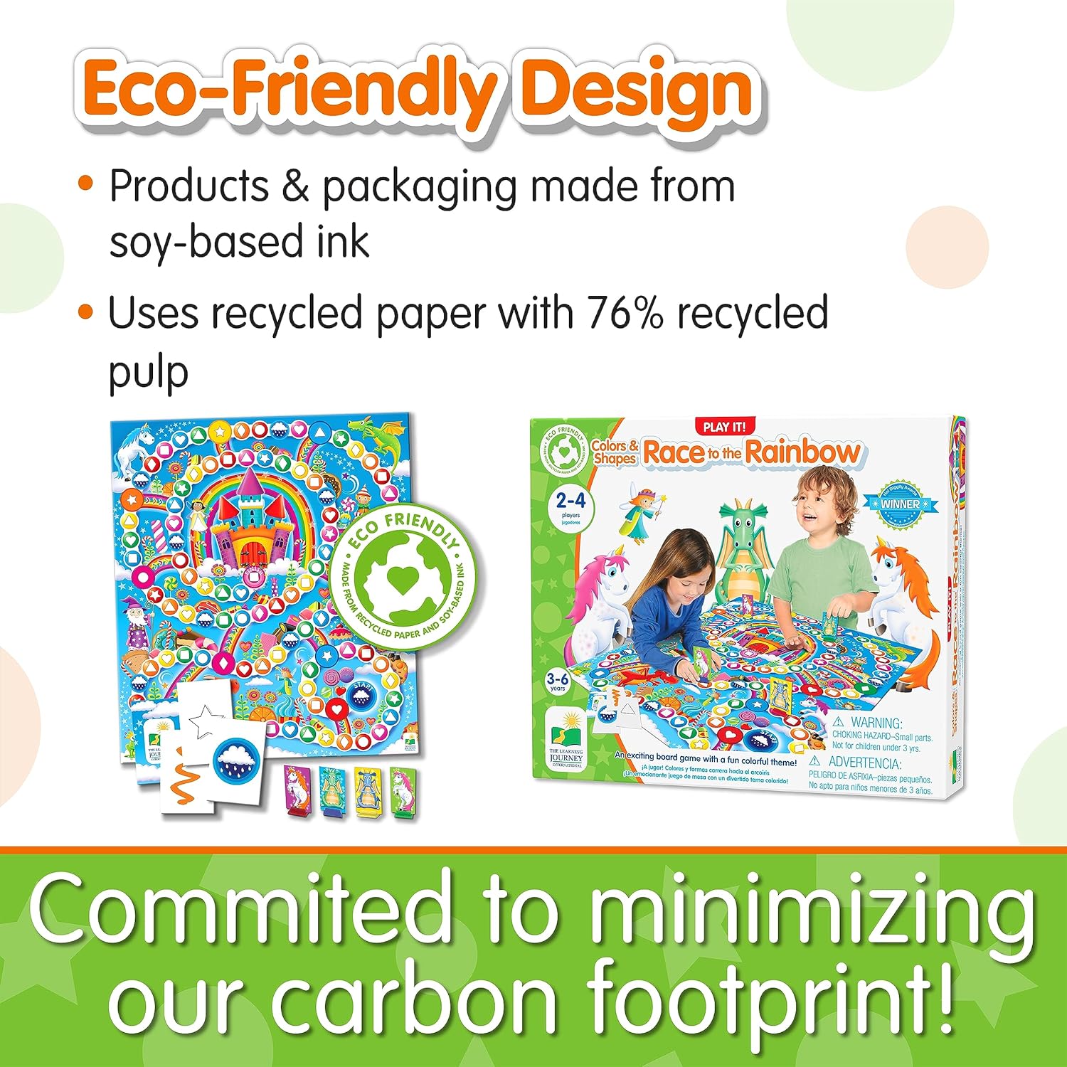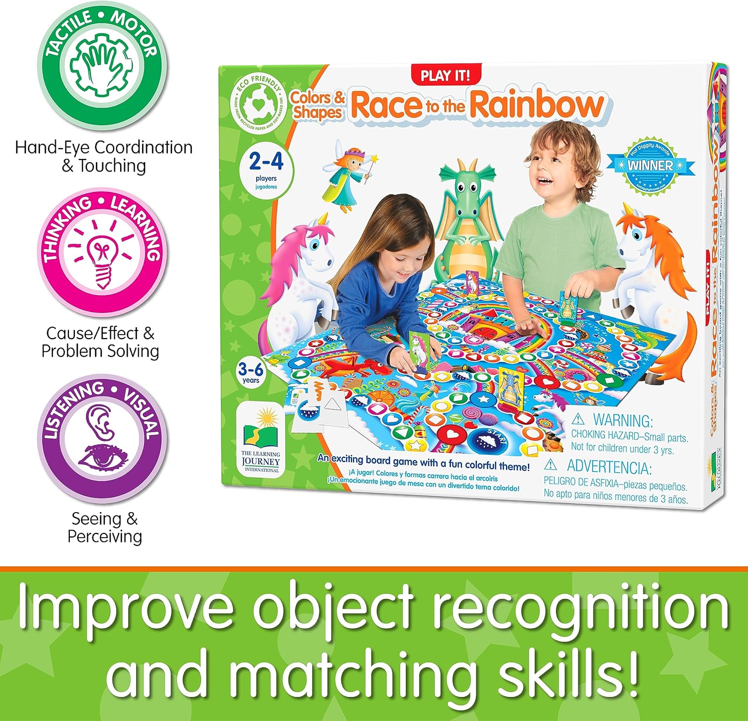 KEY FEATURES – Prepared, set, go! Race to the Rainbow is a difficult and kooky sport that helps educate colour and form recognition! Merely select your unicorn or dragon character and take turns drawing sport playing cards. Sprint your creature alongside the colourful path to the colour or form that’s proven in your card. In case you are fortunate sufficient to land on a rainbow, slide throughout it to get forward. However watch out! In the event you select a rain bathe card, you have to go backwards to the final rain cloud house! The primary participant to succeed in the rainbow citadel wins! Consists of 4 character playing cards, 42 sport playing cards, and sport board.
