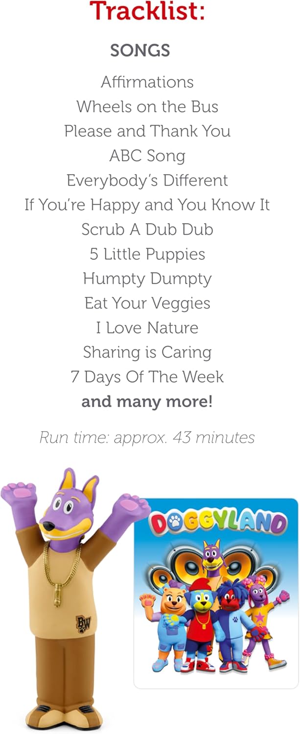This Tonie encompasses a colourful solid of canines who educate and entertain kids via the facility of singing, dancing, and rapping. The solid consists of Bow Wizzle (performed by Snoop Dogg) and a bunch of puppies desirous to study! Doggyland’s songs are made by award-winning producers and singers who’ll have the entire household singing and dancing alongside!
