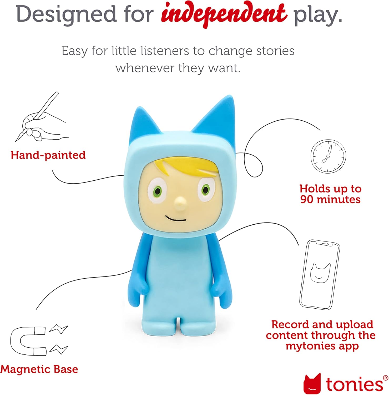 Use the mytonies app (or my.tonies.com) to report your individual adventures, obtain free content material from Tonies, or switch your individual present audio recordsdata onto a Artistic-Tonie.