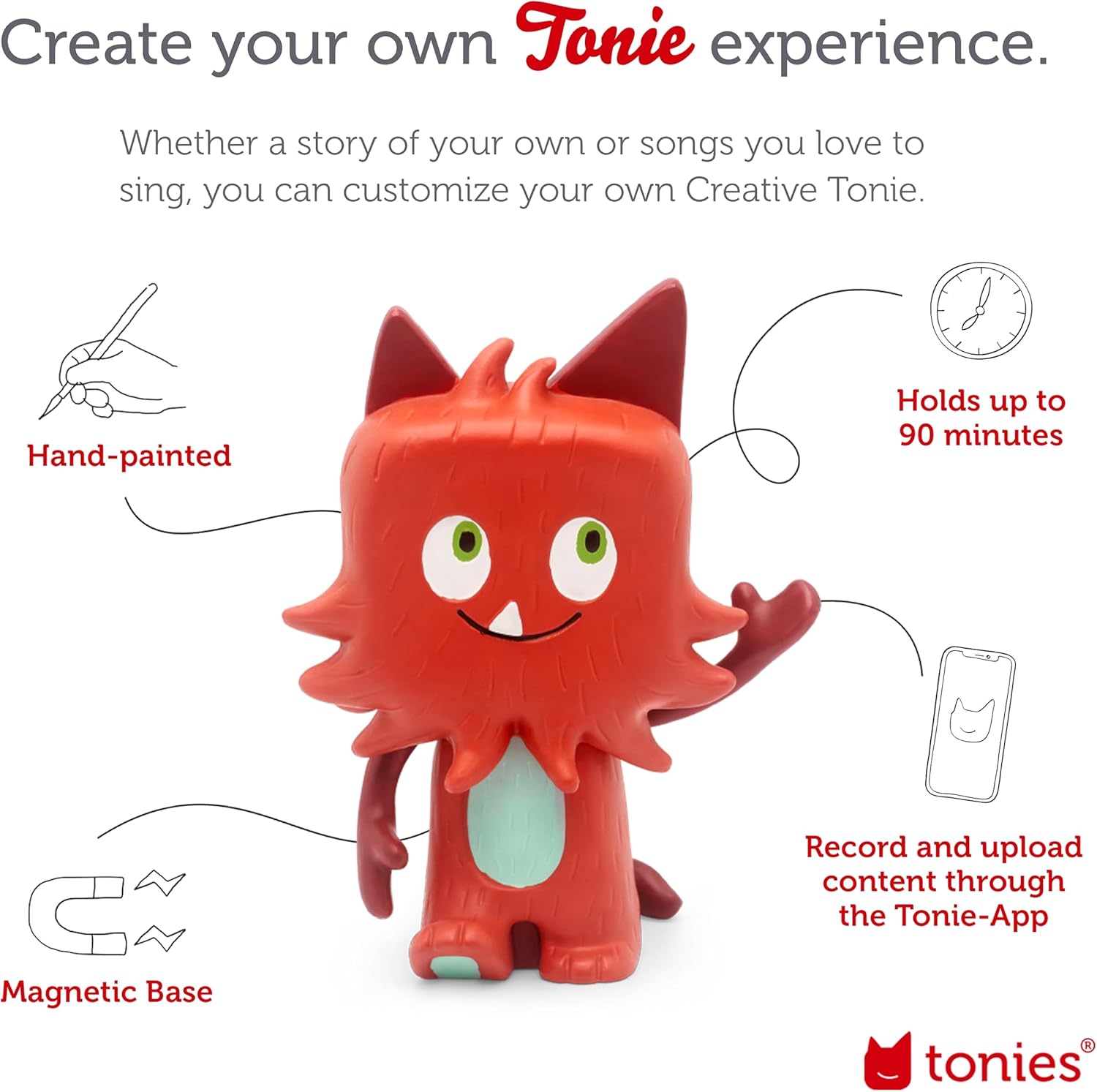 Use the mytonies app (or my.tonies.com) to report your individual adventures, obtain free content material from Tonies, or switch your individual present audio information onto a Artistic-Tonie.