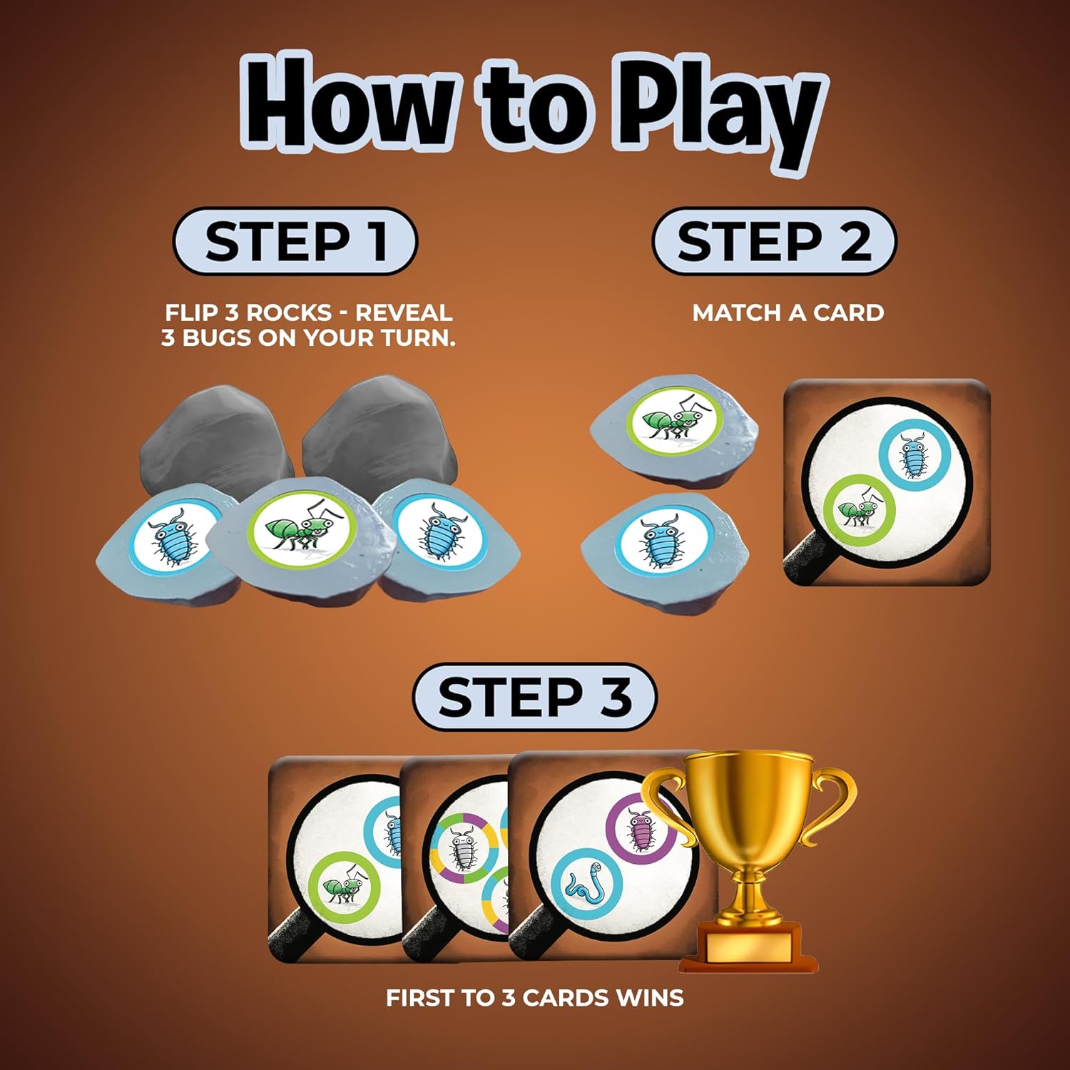 Bug Matching Enjoyable: Flip 3 rocks to disclose hidden bugs. Match them to the bug mixture on the Magnifying Glass playing cards to attain a degree. No match? Secretly peek at a 4th rock earlier than flipping all of them again. Enjoyable, strategic gameplay for teenagers that blends reminiscence with pleasure.